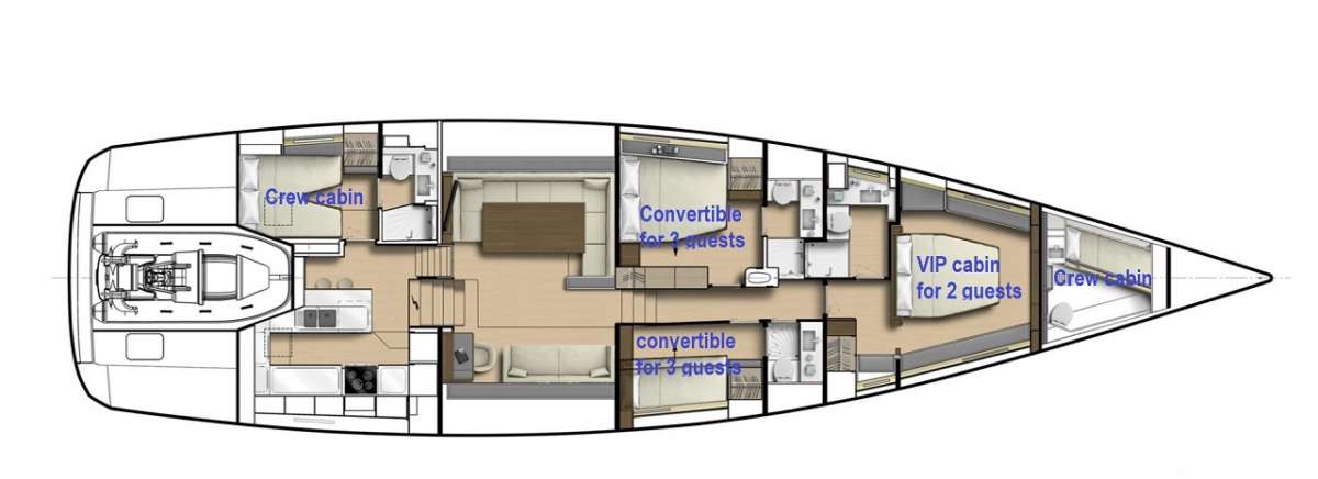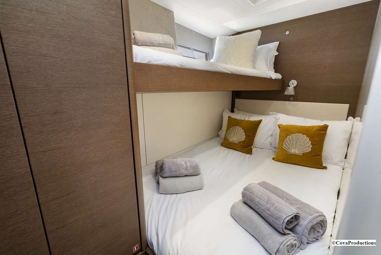 MAOYA offers 3 cabins as below: 1 Master (with queen size bed 1,6 X 2 m ) equipped with 34" flat screen TV, DVD and MP3 players, Apple TV and 1 safe boxe. 1 VIP cabin for 3 guests with one queen size bed convertible into 2 twin beds and one pullman 1 bunk-bedded cabin for 3 guests with a lower bed convertible in a double bed 1,4 X 2 m but this cabin is nonetheless for children or teenagers only The Master and VIP cabins are with en-suite bathroom and separated head. In the bathroom of the bunk cabin, the head and shower are not separated. All cabins have: A/C with private control, plugs 220V, hair dryer and plug for shaver, USB plugs. *All our bath amenities is from ‘L'Occitane en Provence'.