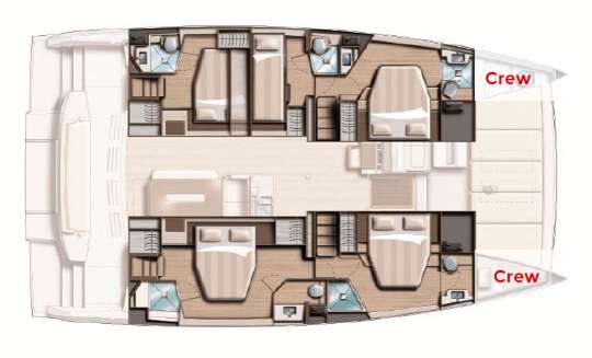 Guest cabins: 1 Queen cabin, 3 double, 1 bunk beds + 5 heads Crew cabins: 1 forepeak cabin + 1 WC to share with clients
