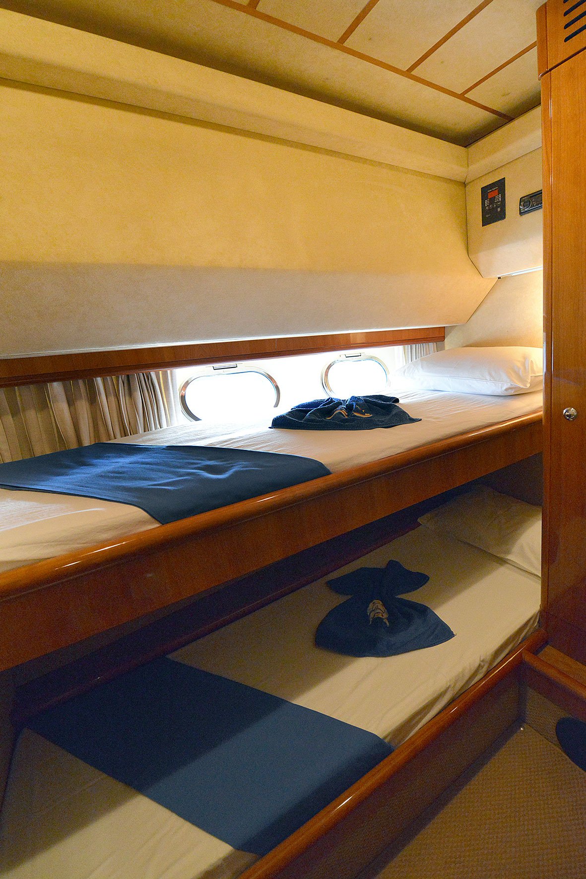 8 Guests in 2 Double & 2 Twin cabins, fully air conditioned. SIZE OF BEDS: MASTER: 160cm X 200cm / VIP 1: 180cm X 200cm TWIN 1: 200cm X 80cm - 2 beds/ TWIN 2: 200cm X 72cm - 2 beds SIZE OF CONVERTIBLE BED TWIN CABIN 1: 250cm X 250cm TWIN CABIN 2: 250cm X 300cm HEIGHT OF CABINS:210cm