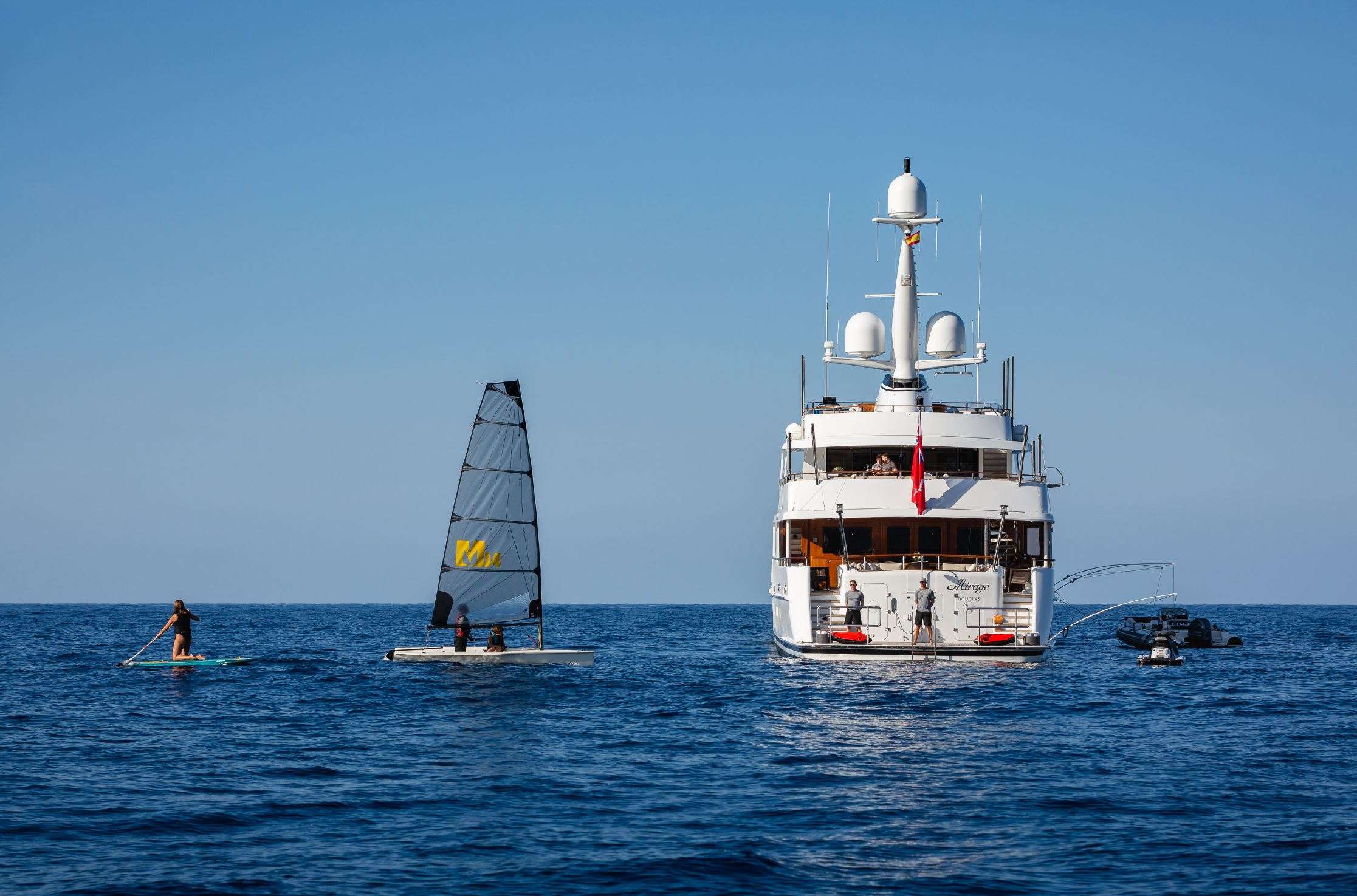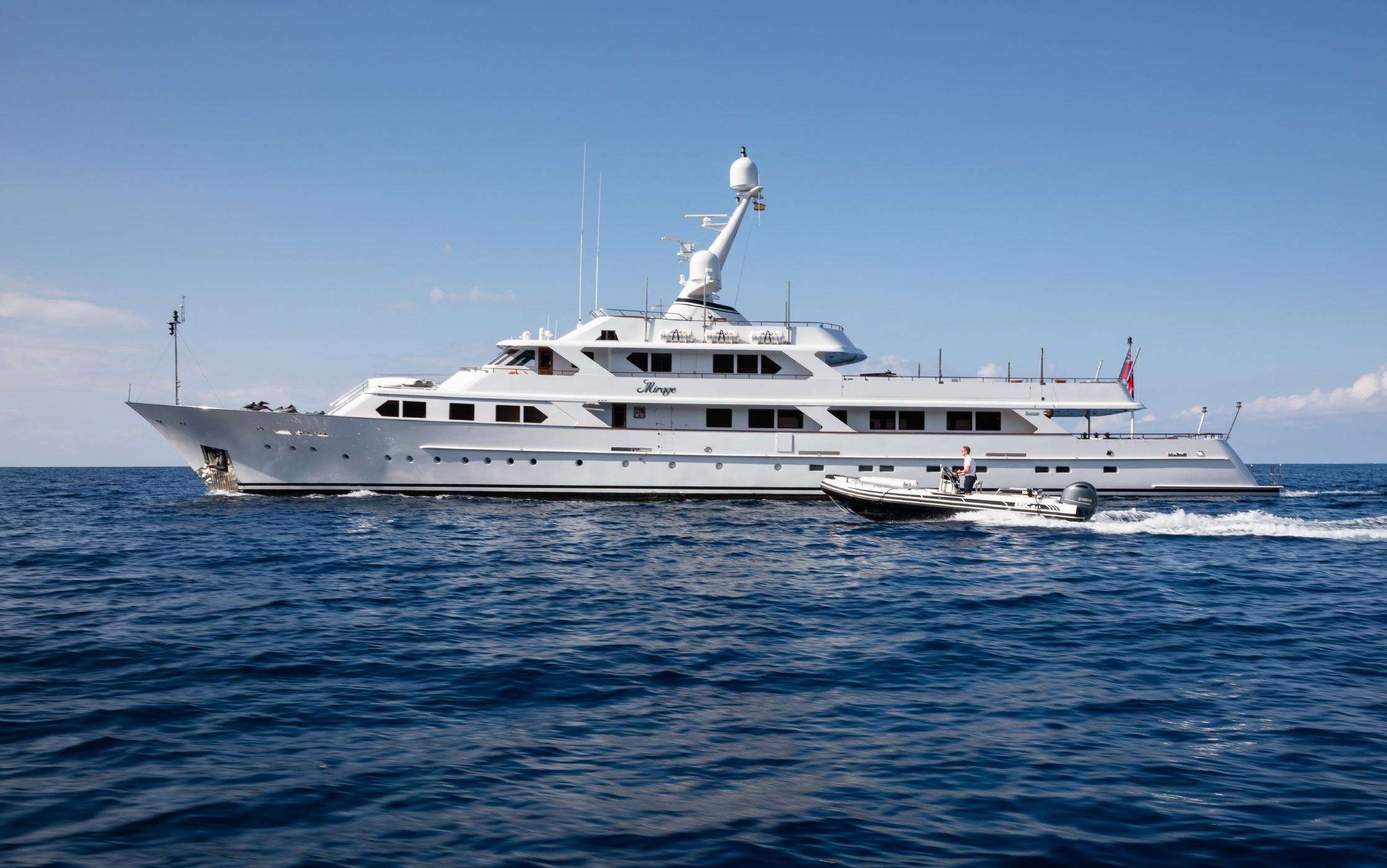 The recently refitted MIRAGE superbly combines open and covered deck space with great internal volume. There are 8 cabins available including a Master and VIP on the main deck, 2 double cabins and 4 twin cabins on the lower deck. Her spacious living areas are designed with teak, subtle cream fabrics and contemporary furnishings. Her outstanding sun deck, with large dining area, huge sofas, and her vast main aft deck area, ensures outdoor living at its best. All staterooms have individual climate control and are ensuite. Each is equipped with Sonos sound system, LCD screen & DVD. Owner's Suite, Main deck, foward: KING size bed with en­suite bathroom with shower and bath and 52 inch SAT TV & DVD. VIP Suite, Main deck forward of Owner's Suite: KING size bed with en­suite bathroom (shower) and SAT TV & DVD. (2) Guest Staterooms, Lower deck: Queen size with en­suite bathroom (shower) and LCD screen & DVD. (4) Guest Staterooms, Lower deck: (4) TWIN with en­suite bathroom (shower) and LCD screen & DVD with Pullmans. SAT TV IN Master, VIP and Skylounge/Outdoor cinema. Choice of 610 daily newspapers from 76 countries in 36 languages. For static charters she can sleep up to 20 guests when safely moored to the quay. Content is not guaranteed, neither may it be used for contract purposes. www.yachtmirage.com