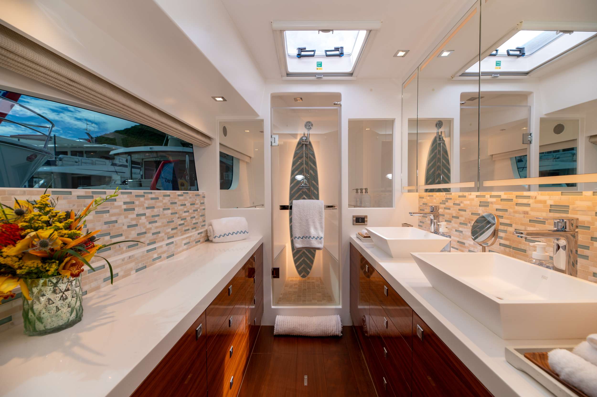Mucho Gusto, the newest model from Horizon, is the ultimate in luxury yachting. Launched in February 2019, she is the only 65-foot Horizon Power Cat available for charters. Guests are pampered from the moment they step aboard, with a choice of three exquisitely appointed suites: an on-deck California king Primary suite, a VIP king suite, and a twin berth-or-king cabin, all with en-suite bathrooms. The main deck features a gracious aft deck and dining area, two swim platforms with a stainless outdoor shower, and a high-low platform. The flybridge is a true oasis, with a fully air-conditioned helm station, wet bar, and alfresco dining area. Guests can also relax on the exterior loungers on the broad sundeck, while the chef cooks up a feast in the covered BBQ area. A day head on the flybridge ensures that guests are always comfortable. On the bow, guests will find recently updated sun cushions for six, perfect for enjoying the sun and sea breeze while underway. Mucho Gusto is the perfect yacht for those seeking the ultimate in luxury and relaxation. With her spacious accommodations, state-of-the-art amenities, and professional crew, she is sure to create an unforgettable charter experience. Inquire about Healthy Retreats!