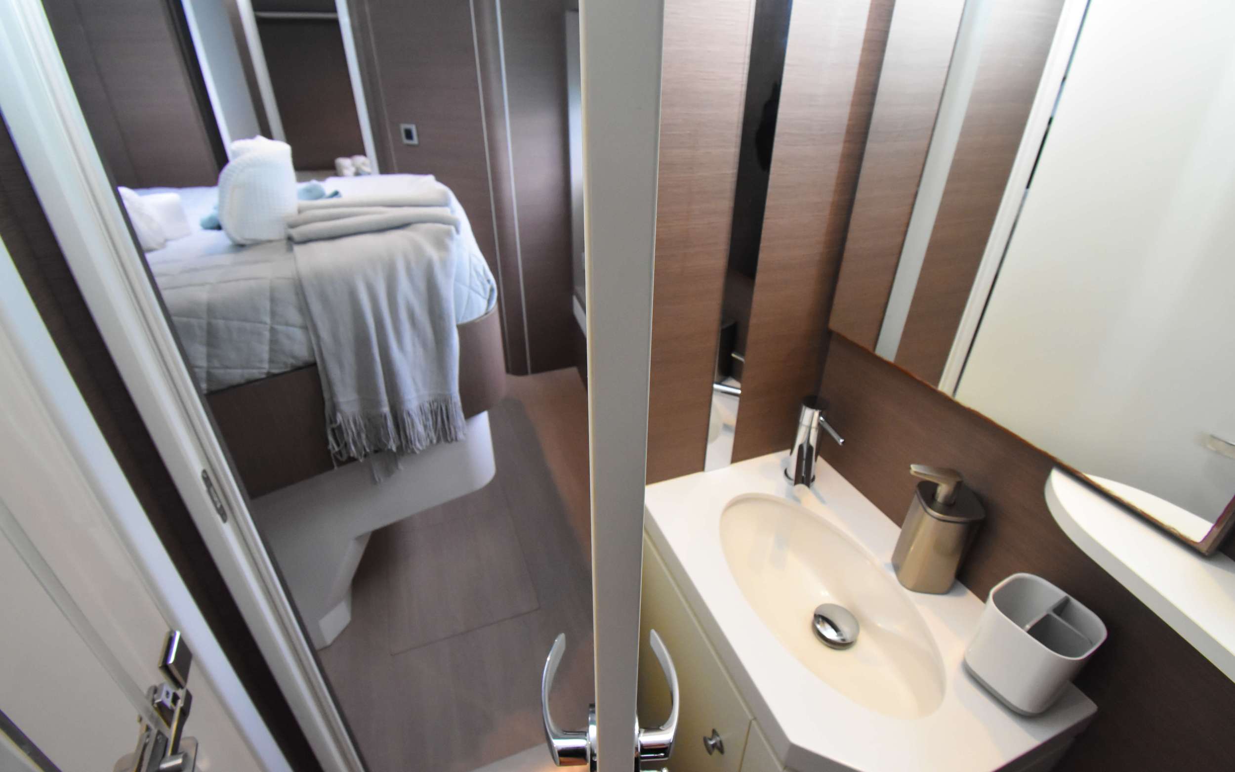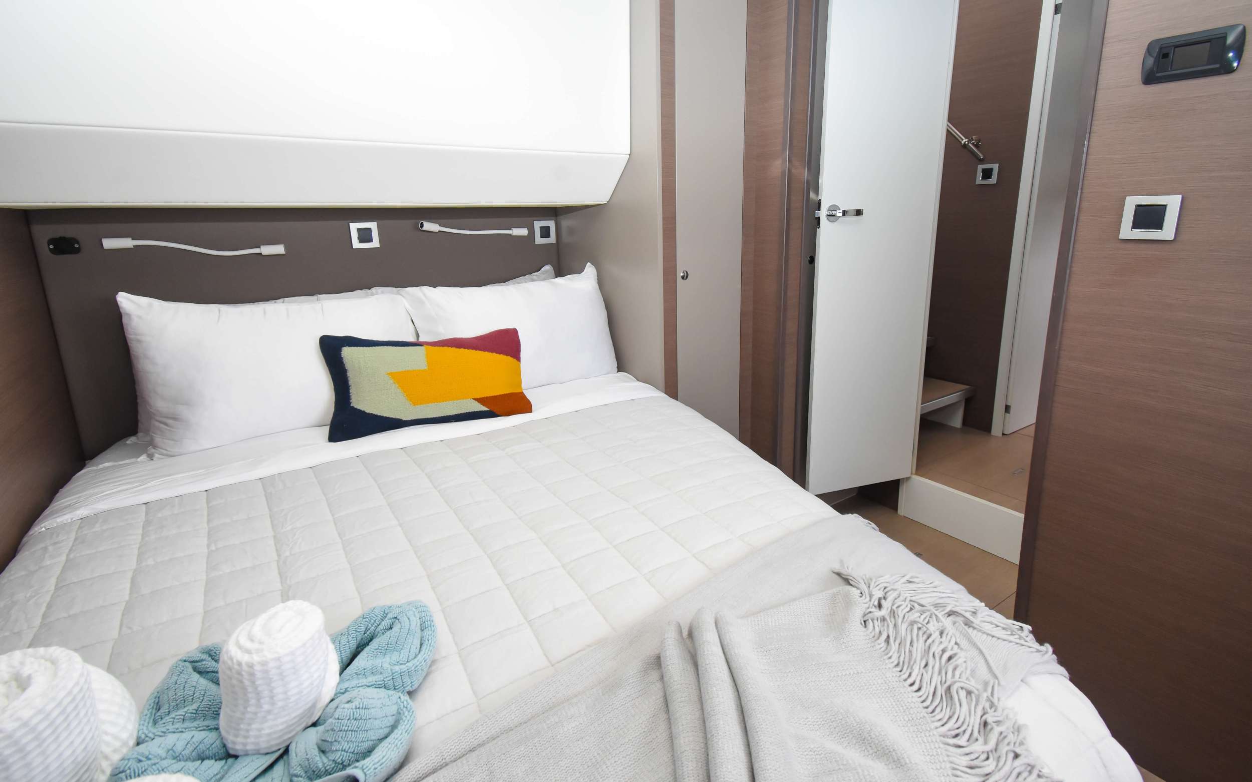 This brand new 2022 luxurious sailing catamaran, NAE KAE, is a superb example of what Bali can design. As you step on board in to a beautifully appointed cockpit, complete with teak floors and dining table for ten and a comfortable lounging bench, you immediately realize what a unique charter experience you are about to have. As you make your way up to the flybridge you'll be blown away by the amazing turquoise water with 360° views and enjoy the up-close view of the sails. It's also a great place to read your favorite book or a favorite spot for appetizers and cocktails at sundown. The main salon is comfortable and luxurious with open spaces and natural light fed by all the windows surrounding you. All guest cabins are spacious with large windows and offer plenty of natural light. For your comfort, every cabin offers queen sized beds and private baths with dedicated shower stalls as well as individual cabin A/C control. The high level of finishing throughout every cabin reflects the luxury that you would expect from a yacht of this caliber. With all the different areas, NAE KAE is show-stopper and has enough amenities for everyone to enjoy! TOYS: 2 Stand Up Paddle Boards, Snorkeling Gear, 1 Large Floating Mat, Tubes, 1 Wake Board, 1 Adult Water Ski Set, 1 Knee Board, 2 Fishing Rods & Onshore Games. DIVING: Offered via rendezvous only