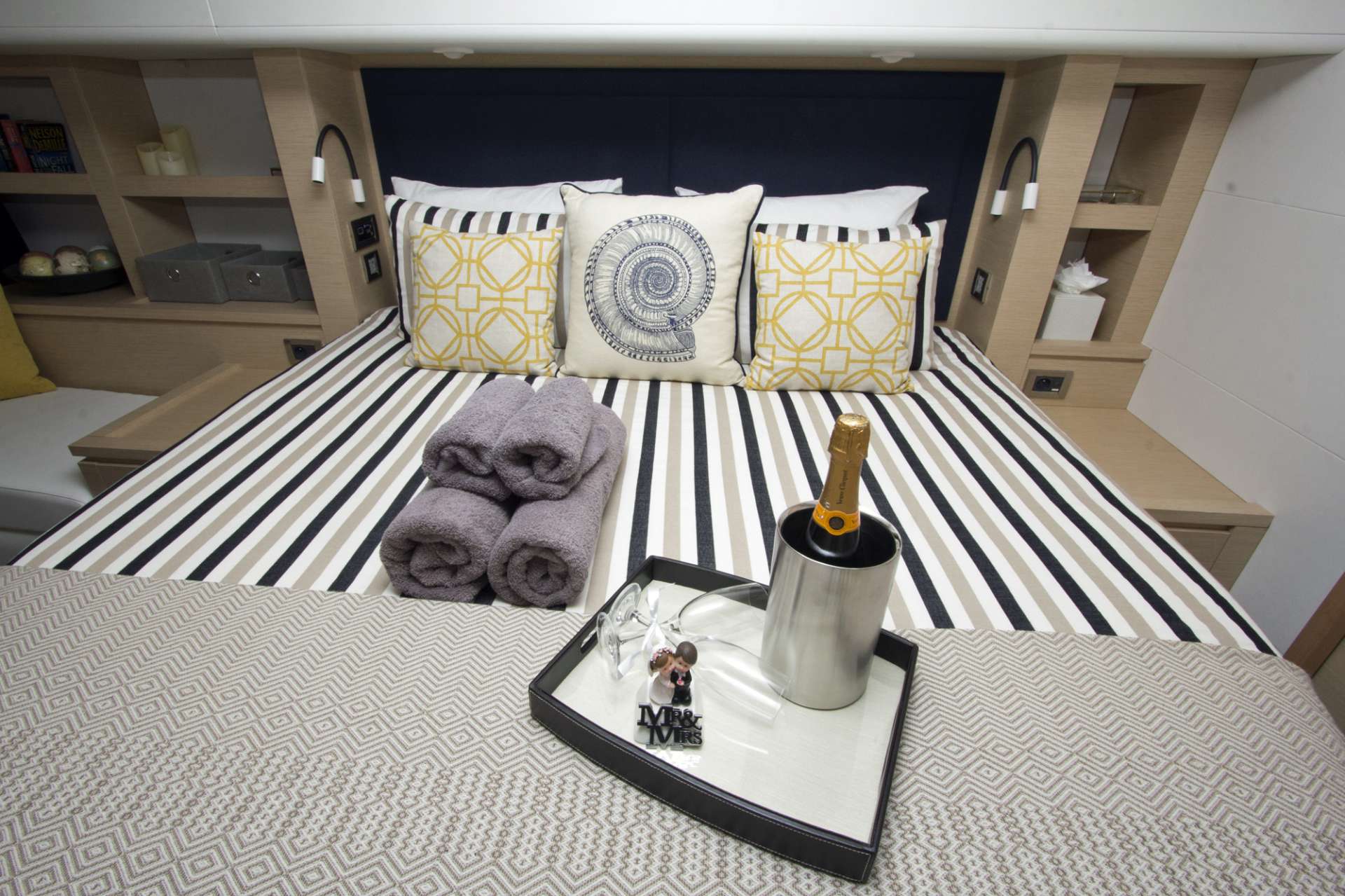 The finest cruising experience yet imagined, NENNE—a Swedish name meaning “strong and brave like a lion"—elevates the concept of a floating holiday to extraordinary new heights. A Victoria 67 built and launched in 2017, she is a highlighted addition to Fountaine Pajot's prestigious Flagship fleet, representing the pinnacle of luxury cruising catamarans. Sleek, elegant, and exceptionally spacious, NENNE boasts an overall length of 67 feet and a beam of 31 feet—offering the ultimate in cruising comfort. The ever-popular flybridge concept has been enhanced on NENNE to deliver a space of stunning sophistication. It is accessed via secure stairs on both sides of the cockpit. The dual carbon fiber helm, offset to starboard, gives the captain excellent visibility and streamlined access to winches, sheets, sails, and the traveler—making sailing more efficient. For guests seeking leisure, the flybridge offers generous seating with benches, a plush sofa, side tables, and the convenience of a sink and refrigerator. The rise-and-fall tables can convert the area into an alfresco dining space, a rare luxury on an FP 67. A large bimini provides shade from the sun, while integrated lighting sets the mood for evening cocktails. Additional side and rear enclosures can block the wind when desired. A double lounge cushion adds the final touch for sunbathing or simply enjoying panoramic views in comfort. The spacious aft deck, shaded by the flybridge above, features additional lounge areas and a refined setting for formal dining. Two large, sumptuous sun pads invite total relaxation, while a projector and oversized cinema screen can be enjoyed from both the cockpit and the saloon—perfect for movie nights at sea. Inside, the saloon impresses with urban-chic décor, luxurious leather upholstery, and expansive, air-conditioned comfort. The open galley is outfitted with state-of-the-art appliances, fine china, and a wide selection of glassware. A large seating area centers around an electric rise-and-fall coffee/dining table, ideal for entertaining. An extra chart plotter and helm station are located at the chart table, from which the vessel can also be piloted. Accommodations include five en-suite cabins for up to 10 guests: one King, three Queens, and one Twin that can convert to a King upon request. Each cabin features independent A/C, a Sony and Apple flatscreen LED TV with access to a film library of over 500 titles, a Bose Hi-Fi music system, and high-quality linens and towels—including thick, NENNE-branded beach towels. The expansive primary cabin includes a desk/dressing table and a cozy sofa. NENNE also boasts an impressive collection of water toys, including snorkel gear, kayaks, stand-up paddleboards, a wakeboard, adult and children's water skis, a variety of towable inflatables, and a Yamaha 70hp tender. For scuba enthusiasts, NENNE offers a premium diving experience with a full range of top-tier equipment and an onboard dive compressor—making her one of the best choices for underwater exploration in luxury and style.