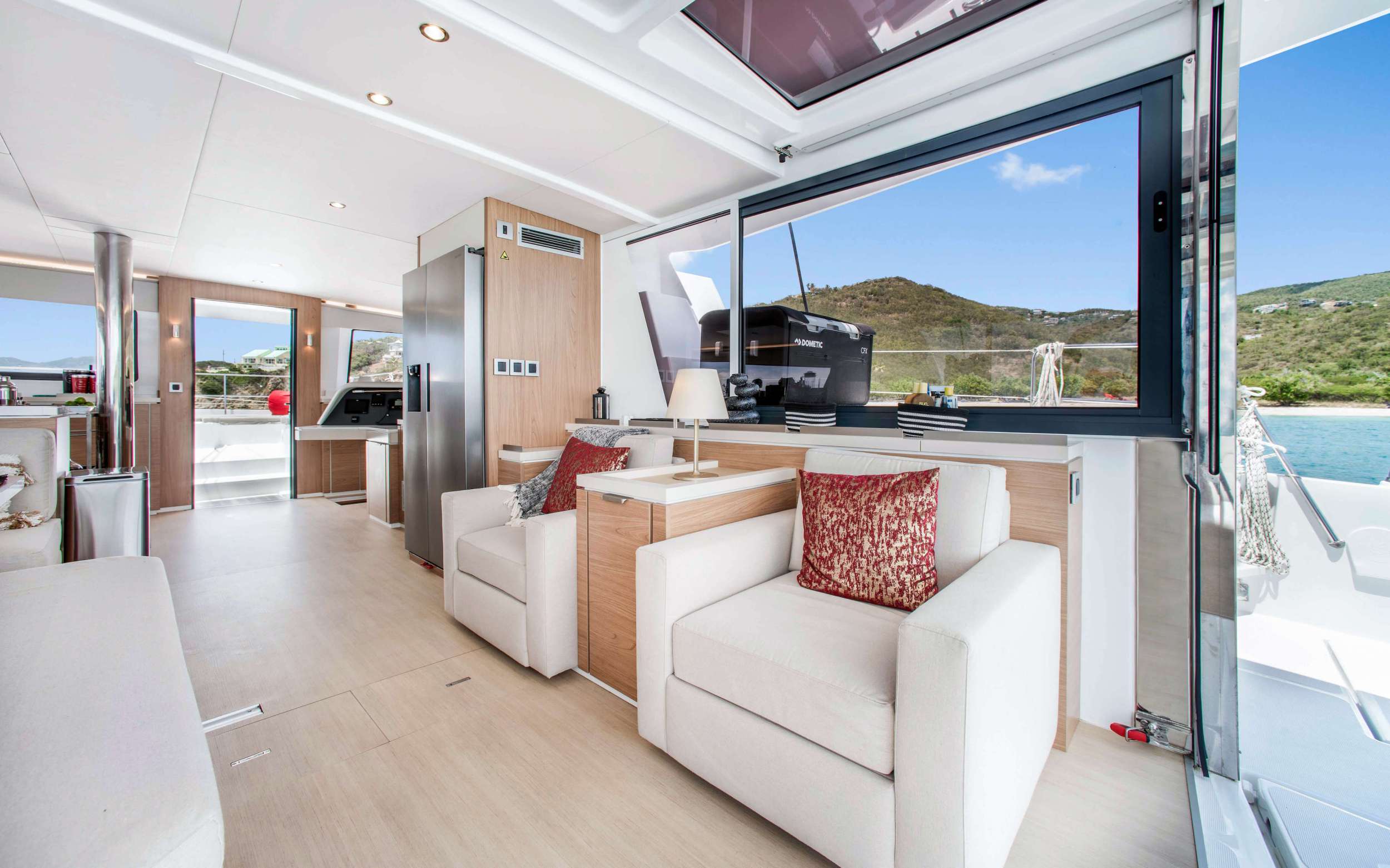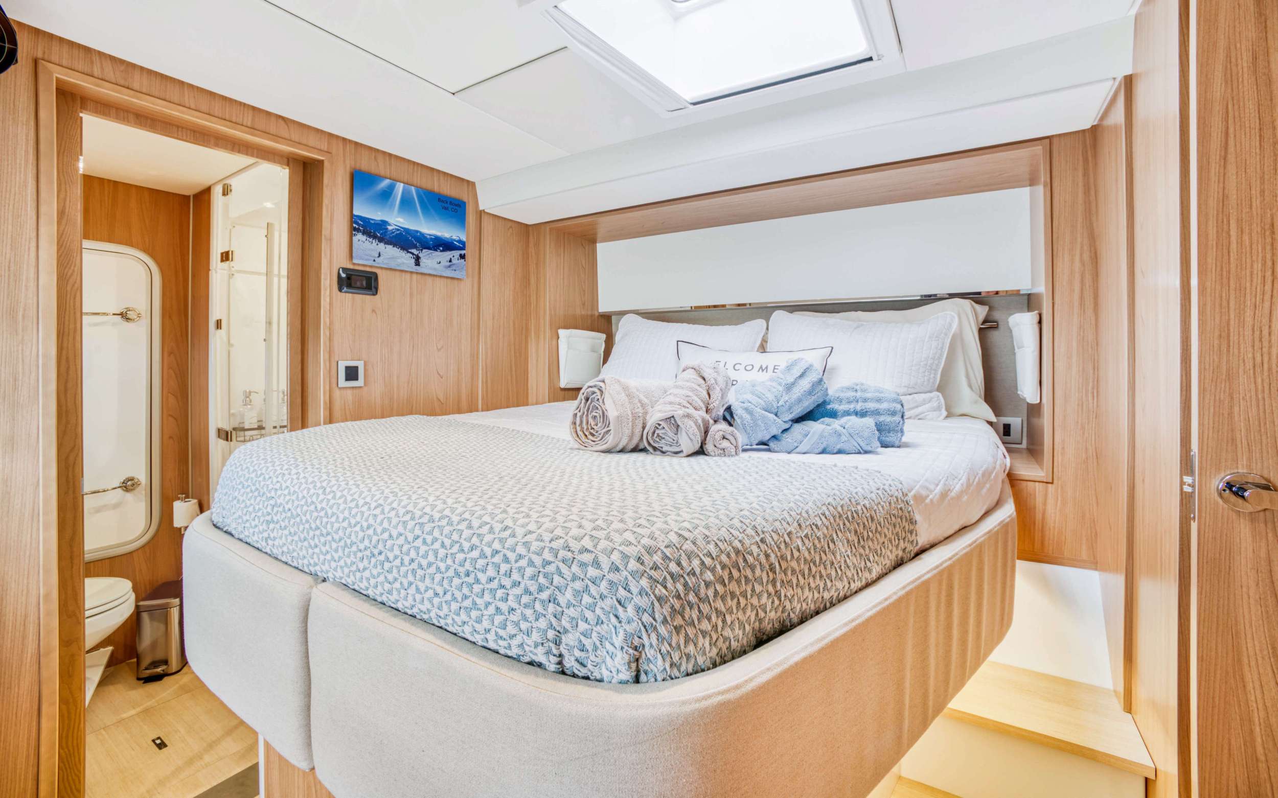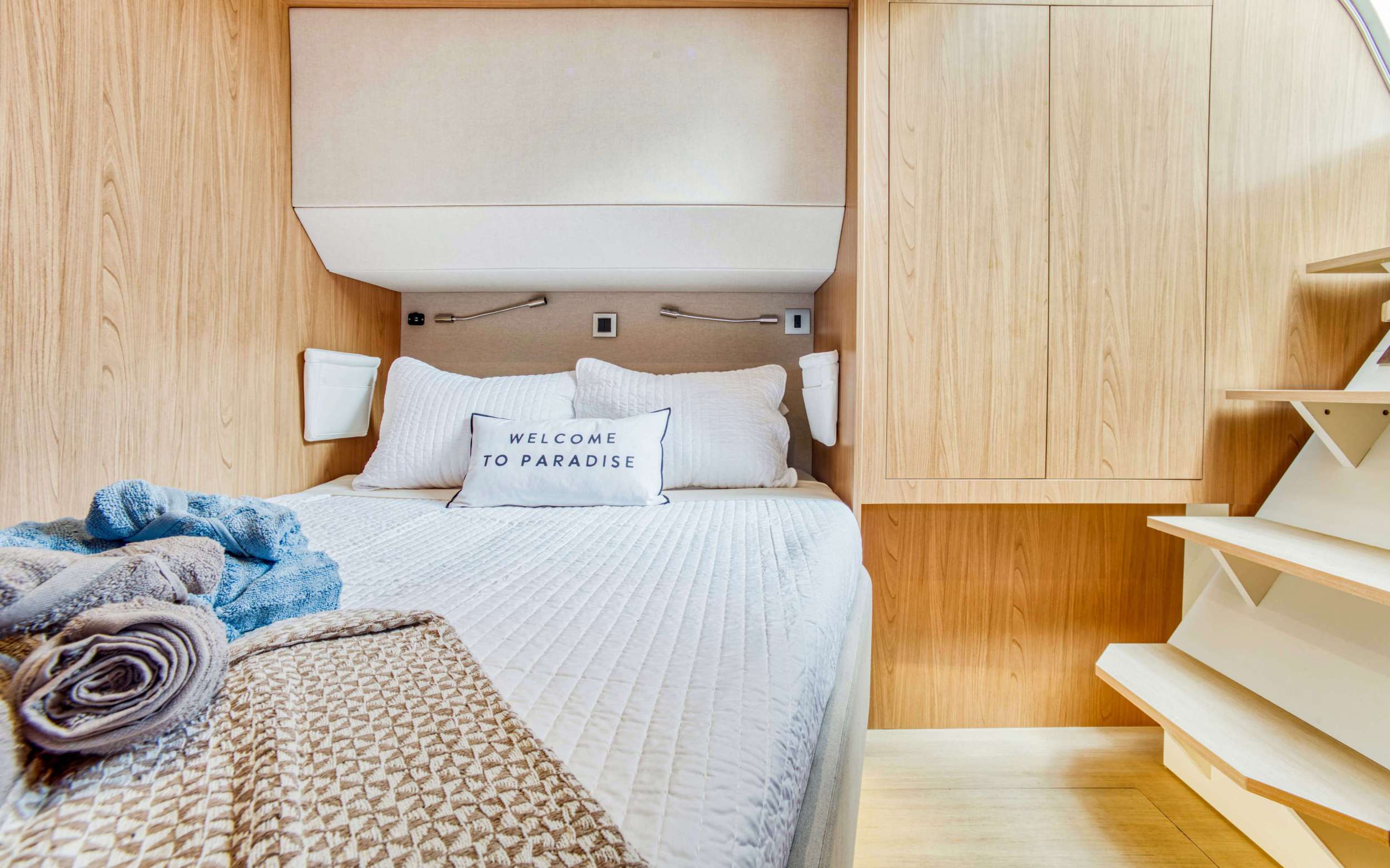 The brand-new Bali sailing catamaran, NO INHERITANCE, is a shining illustration of Bali's design prowess. You know you're in for a one-of-a-kind charter experience the moment you step foot in the gorgeous cockpit, including a dining table for eight, and a comfy lounge bench. Making your way up to the flybridge will reward you with breathtaking views of a turquoise bay and the sails from every angle. It's also a lovely site to enjoy some sunset cocktails and light fare while reading a good book. The main salon is spacious and bright thanks to the abundance of windows that surround it. All five of the guest quarters are roomy and well-lit thanks to the numerous windows. There are 4 Queen Cabins and 1 Twin Cabin, each with a private bathroom with a shower and a sound system with both shipwide and in-cabin controls. In addition, all of the staterooms have high-end finishing work befitting a vessel of this quality. NO INHERITANCE is a spectacular experience that offers something for everyone thanks to its many distinct settings.