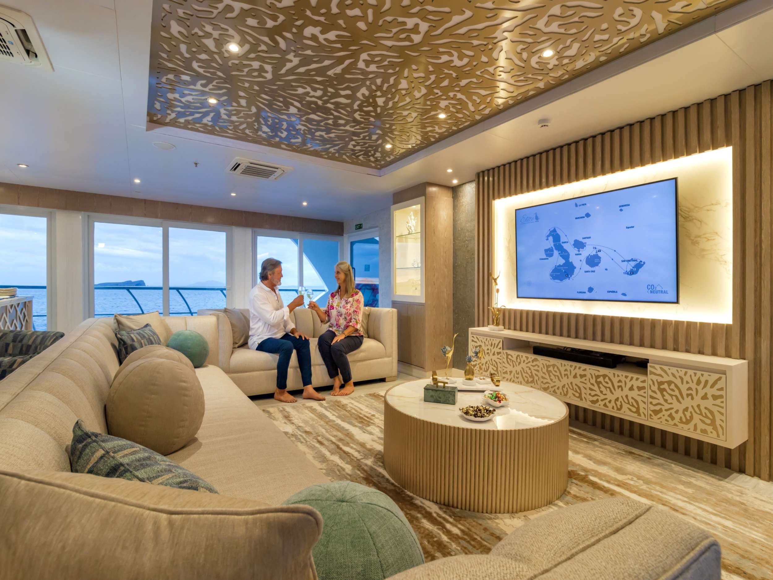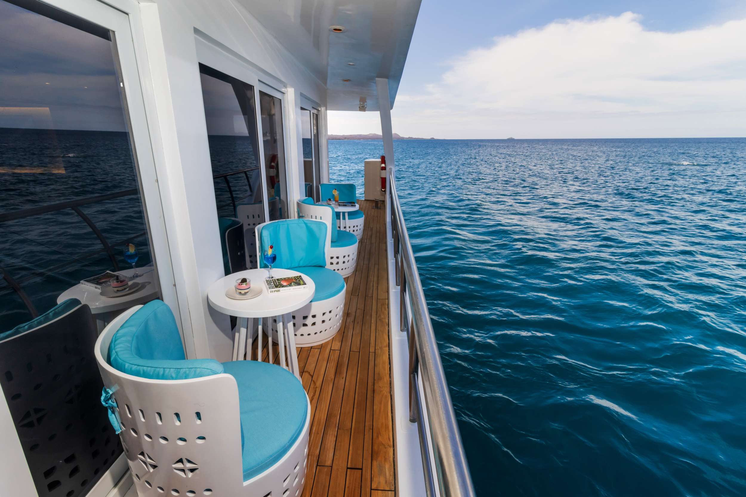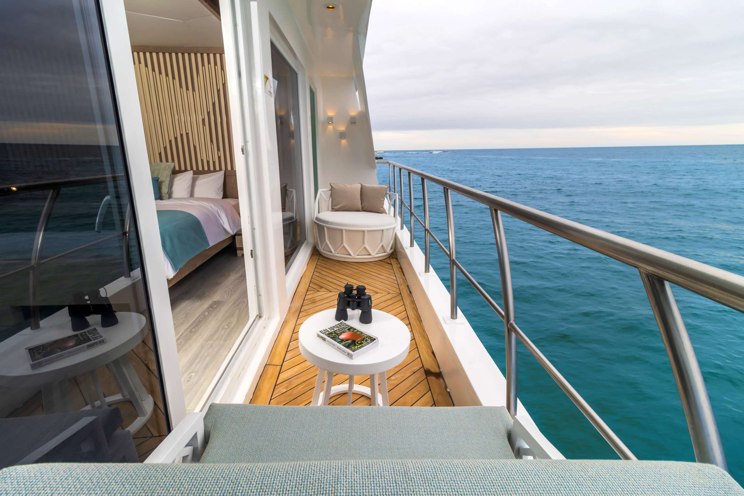 We offer our Golden Suites that make your stay on the Elite Catamaran truly special. These suites have large windows that give you amazing views of the ocean. You can choose to have one king-size bed or two twin beds, making it perfect for any traveler's needs. Our Golden Suites are designed with luxury and comfort in mind. They come with private balconies where you can enjoy fresh air and stunning sights of the Galápagos Islands right from your room. The rooms on our Elite Catamaran redefine the comfort and style standards. Every single room has a private balcony and serves as a sanctuary providing, through broad windows and private decks, breathtaking scenes of the Galapagos Islands. This option is perfect for those who seek an intimate experience with nature without giving up the comforts of a high-end hotel room at sea.