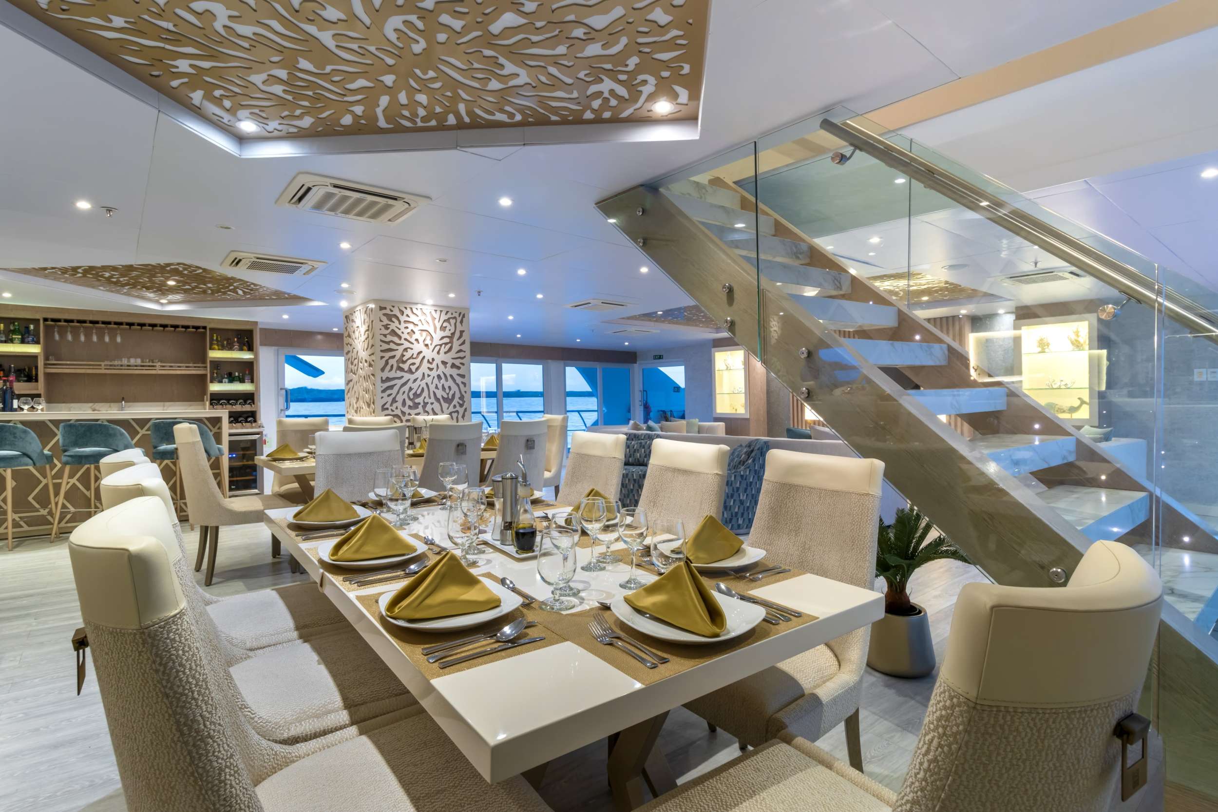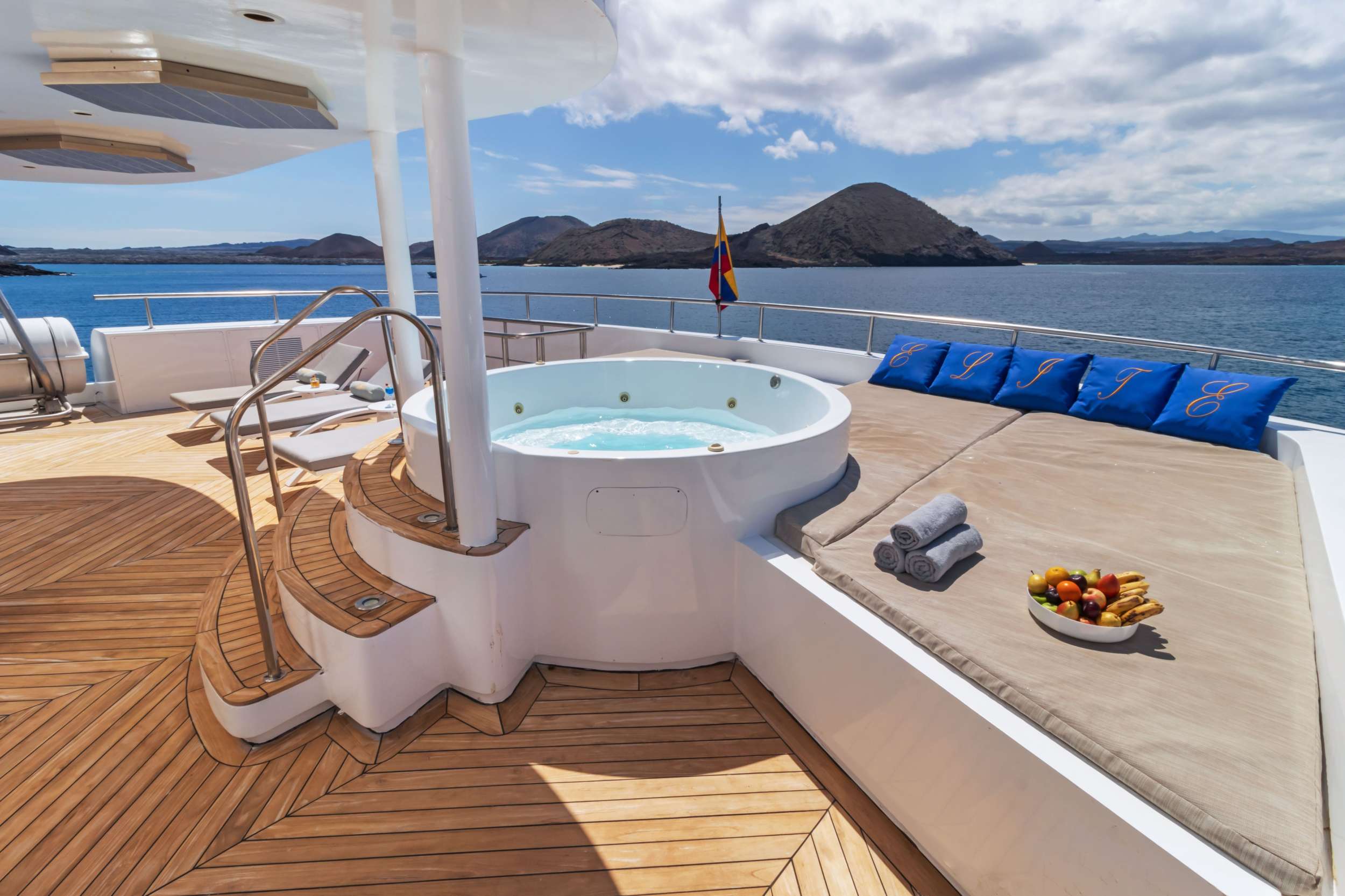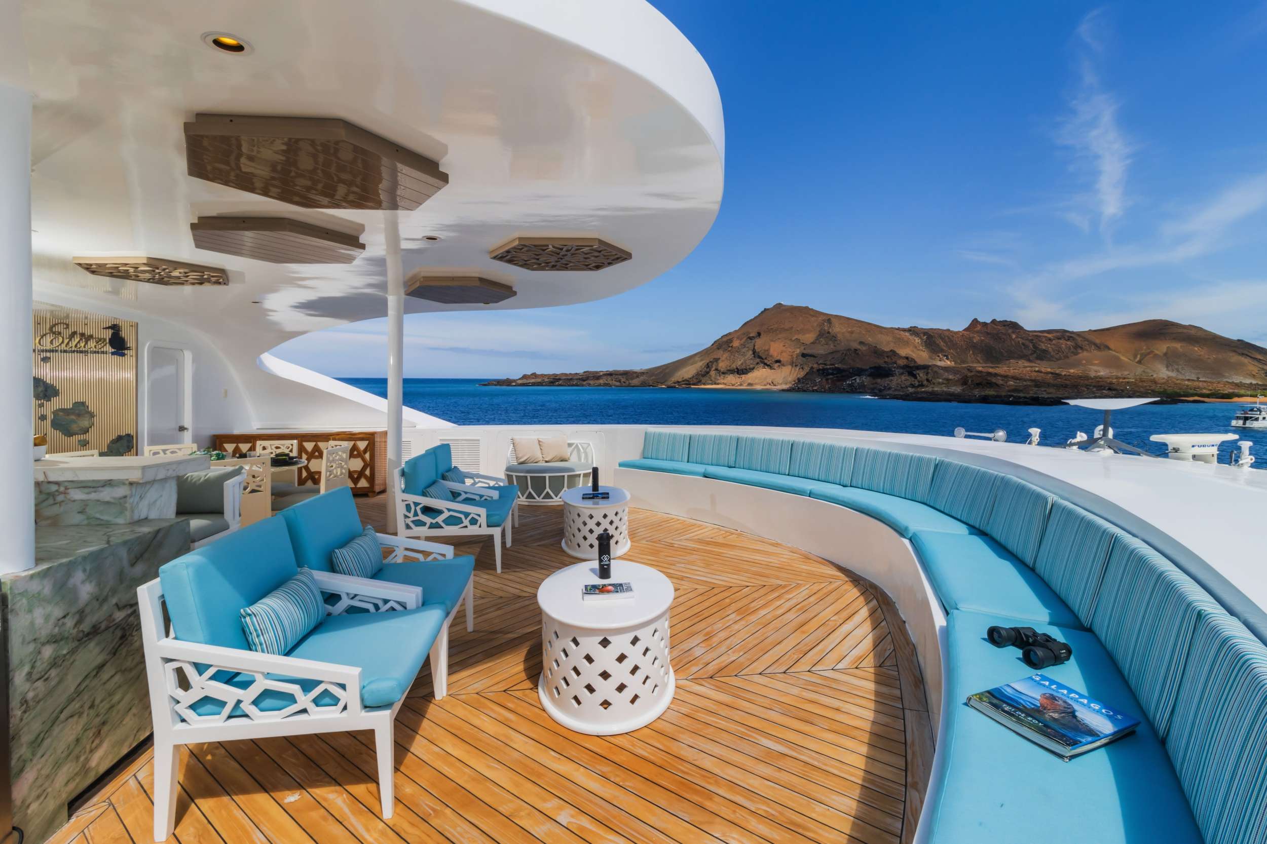 We offer our Golden Suites that make your stay on the Elite Catamaran truly special. These suites have large windows that give you amazing views of the ocean. You can choose to have one king-size bed or two twin beds, making it perfect for any traveler's needs. Our Golden Suites are designed with luxury and comfort in mind. They come with private balconies where you can enjoy fresh air and stunning sights of the Galápagos Islands right from your room. The rooms on our Elite Catamaran redefine the comfort and style standards. Every single room has a private balcony and serves as a sanctuary providing, through broad windows and private decks, breathtaking scenes of the Galapagos Islands. This option is perfect for those who seek an intimate experience with nature without giving up the comforts of a high-end hotel room at sea.