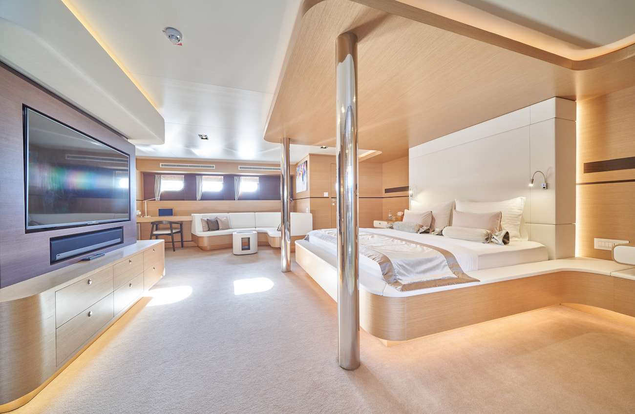 OMNIA sleeps up to 12 guests in 6 staterooms. These are comprised of a massive master suite, a VIP, 2 queens and 2 twin staterooms that can be converted into queens. All staterooms have ensuites and are equipped with a large flat screen television, satellite and local antenna, wifi, interphone, safe box, HVAC control and surroundsound system. Stateroom and Bed Dimensions: Master suite (42m2 / 452sqf) with king bed (200x200 cm / 79x79 in) VIP stateroom (30m2 / 323sqf) with king bed (200x200 cm / 79x79 in) Double staterooms (15m2/ 161sqf) with queen bed (160x200 cm / 63x79 in) Twin staterooms (15m2/ 161sqf) with 2 twin beds (90x200 cm / 35x79 in) convertible into queen beds