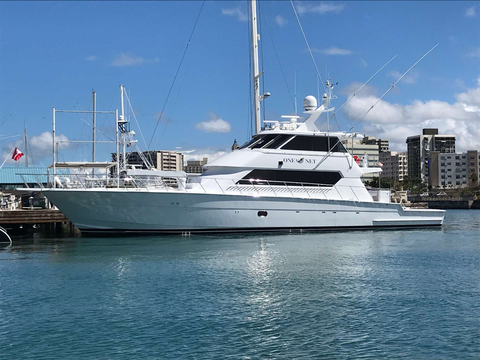 Cruise Belize aboard ONE NET, an 86 ft Hatteras motoryacht. Fish and dive the reefs and cay of this sun dappled Caribbean paradise from the comfort of a spacious and well appointed motoryacht. One Net is an 86' Hatteras, she has a sporting exterior and a luxury yacht interior finish. She is able to accommodate eight guests in four well appointed staterooms with in suite bathrooms . There is a large, comfortable Salon, plenty of outside seating for reading and sunning and a enclosed Fly Bridge with 360 views. One Net is a purpose built sport fishing machine, with a huge cockpit and plus-sized fighting chair. The highly experienced crew will put you on the fish! There is also a complete dive center, for the snorkel and SCUBA enthusiast. One Net is a luxury yacht, with rich wood finished interior and marble baths, and a experienced crew and chef, ready to help make your stay completely care free. The owner's traditional ‘welcome aboard' champagne sets the tone for being pampered and having fun! One Net is an ocean-going yacht, with powerful MTU engines and over two thousand nautical miles range, making it easy to change your destination in comfort and style. For those not wishing to lose contact with the world, ONE NET now boasts Starlink Satelite internet One Net has the flexibility to offer something for everyone.