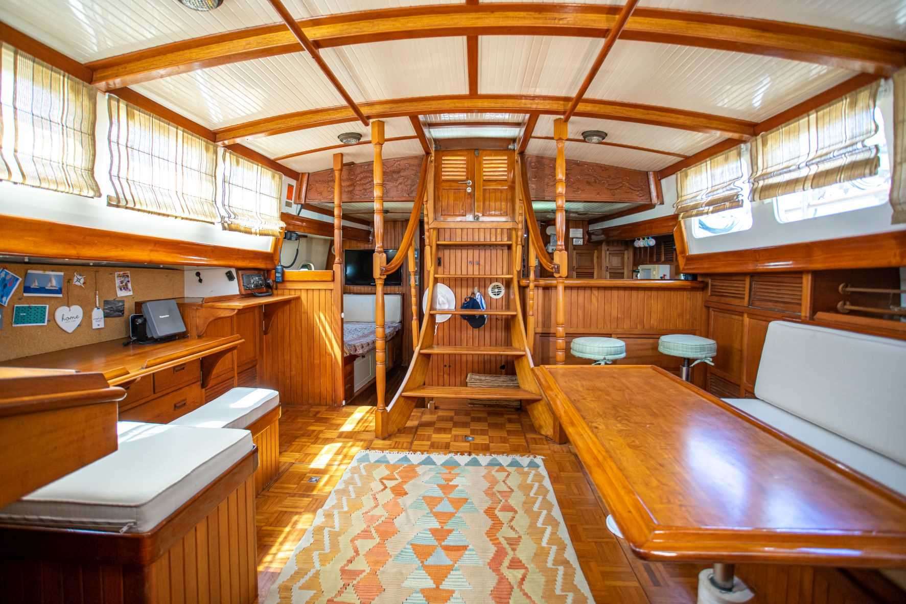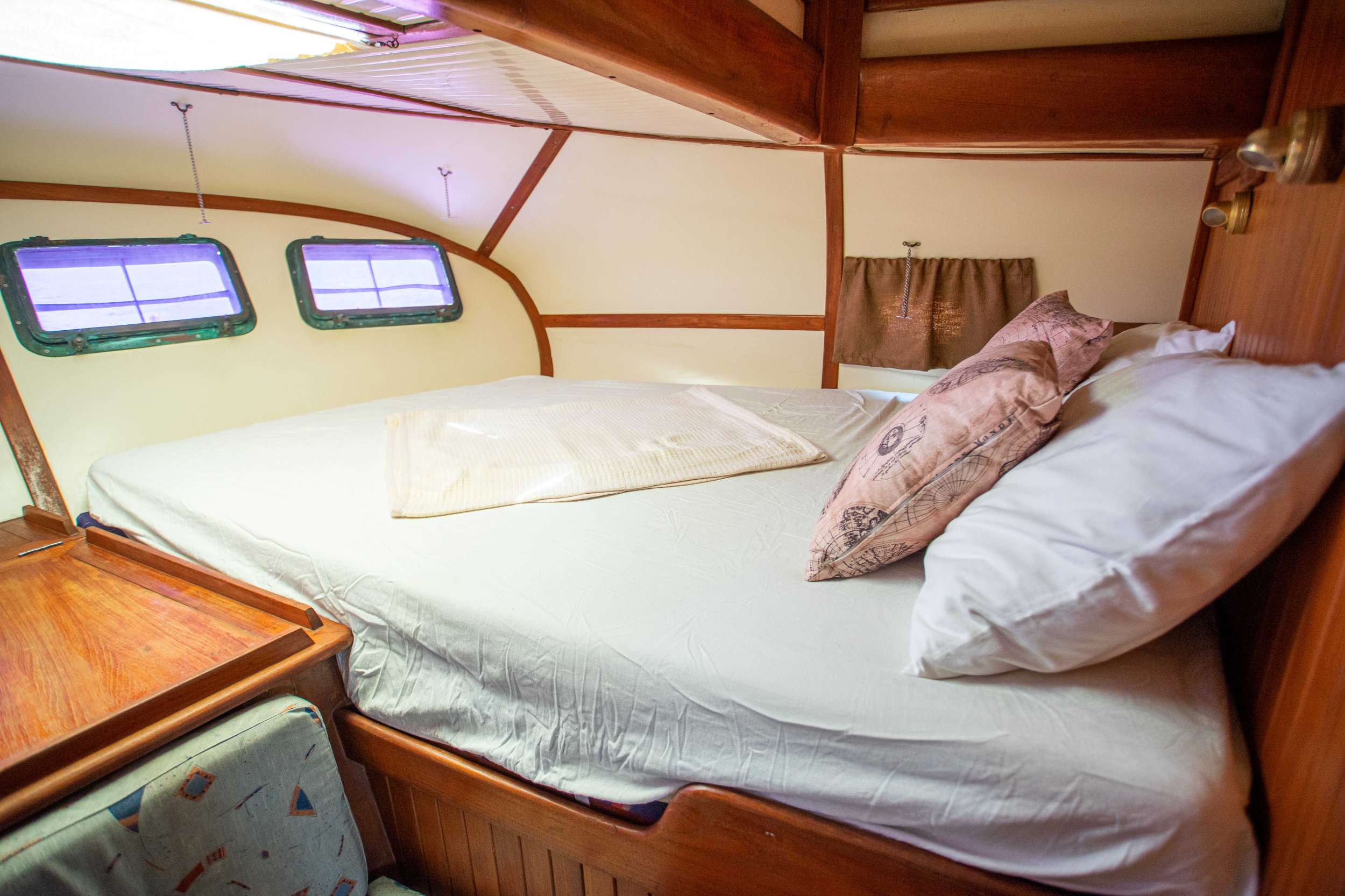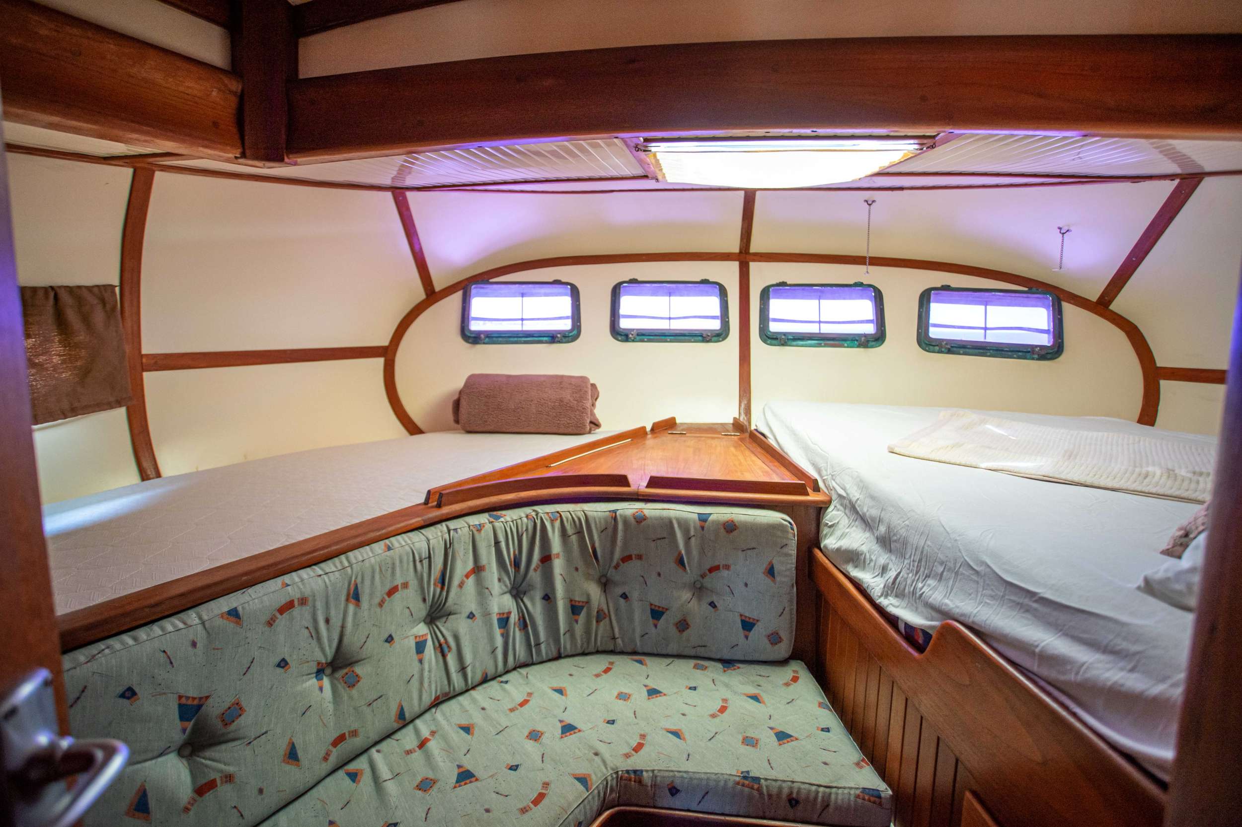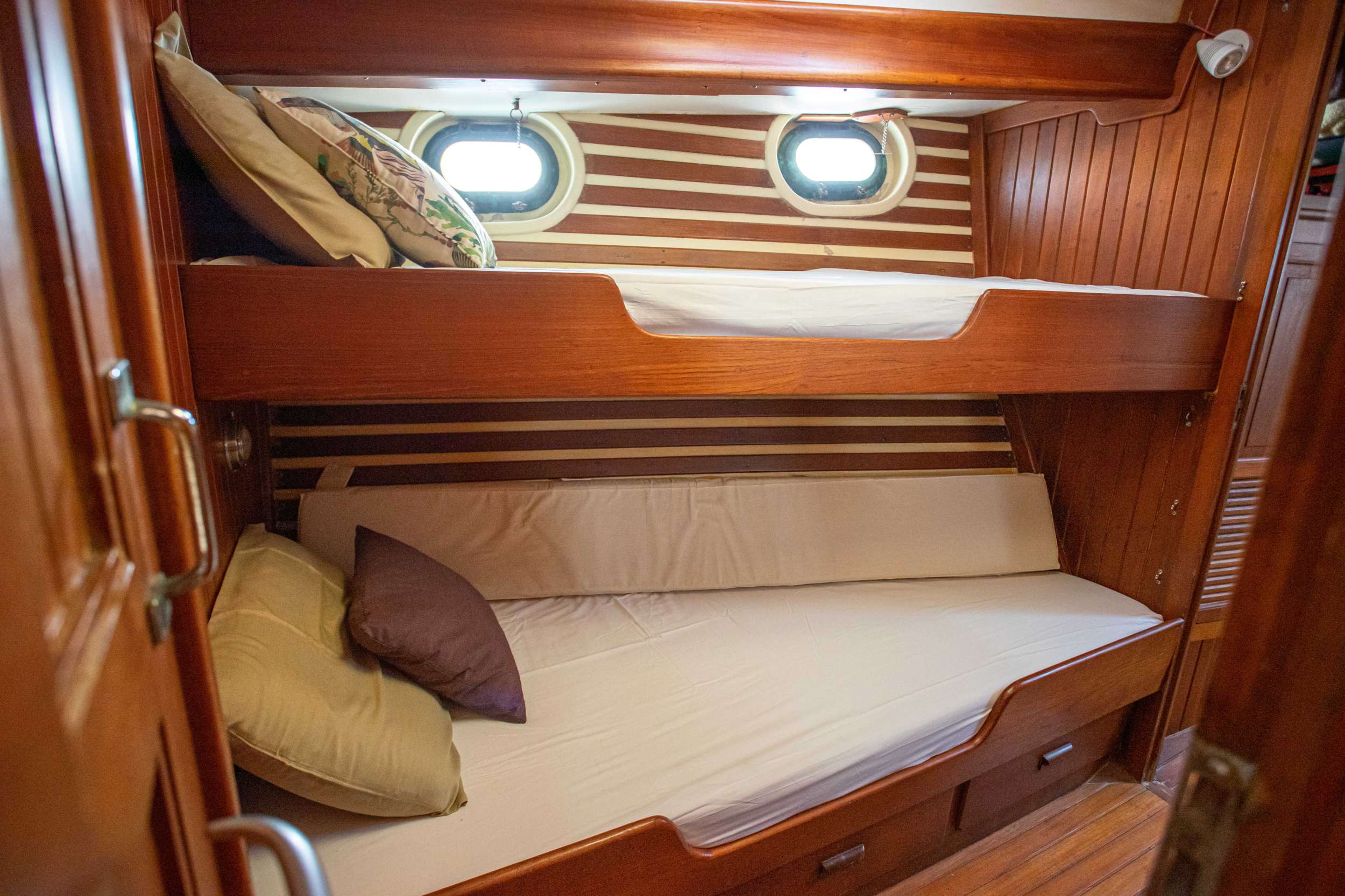 onfe-in short, has 3 cabins- a full beam master cabin at the stern with splendid sea view from the 4 windows on the transom, it has a queen bae and a single bed, there is en suit bathroom with electric toilets. there are two fwd cabin ,to port has a bunks bed(two singles) . the bottom bunk can be pulled out and extended to a small full bed. to stb there is one single that open up to small full. each fwd cabin has it direct access to the fwd bathroom, where there is a separate shower and a manual toilets.