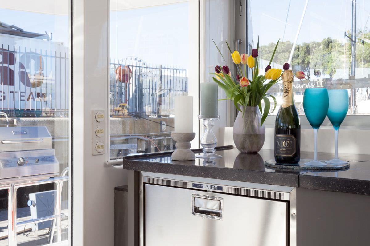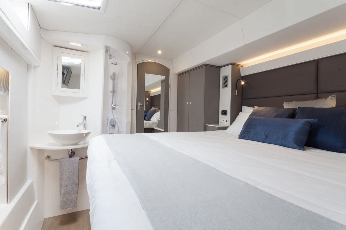 Luxurious and modern, OUT OF OFFICE was launched in December 2016. She offers six equal guest cabins with king size berths, each with private ensuite head (electric head, shower and basin). The guest cabins are bright and spacious and all have individually controlled air-conditioning units for guests comfort. The top deck fly bridge offers a 360 degree view. Her interior salon has lounge area, bar area and formal dining areas are bright, open with expansive views. The salon opens onto the aft deck.