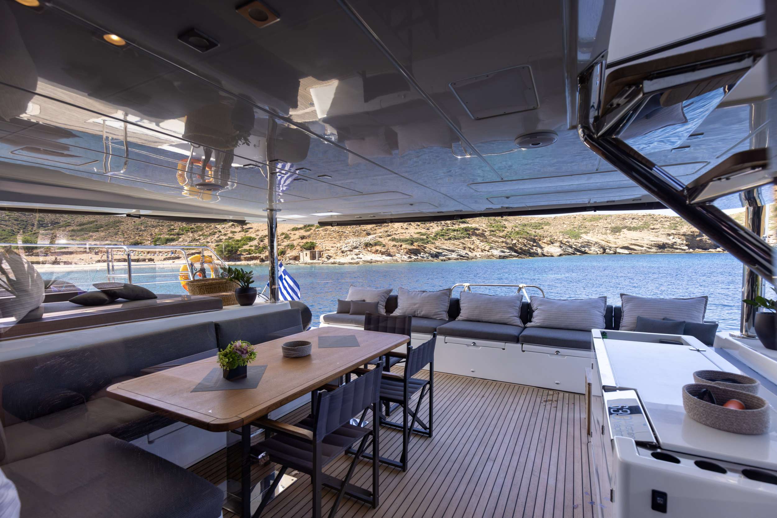 PEARLY GATES is a modern Lagoon 630 Power Catamaran built in 2016, which is offered with 3 crew members (Skipper, Hostess & Cook) for maximum 8 guests. This yacht combines the requirements of offshore cruising with the high standards of a luxury motor yacht. She provides a hardtop bimini with sunbed cushions on the flybridge. She has an elegant interior with spacious salon/dining area and a fully equipped kitchen and can accommodate up to 8 guests in 4 double en-suite cabins with queen size beds. Her 2 aft cabins offer easy access from the outside and provide more privacy. There is a wide variety of water toys available for the guests, including a Tender 4,60m with 60hp engine, water ski, wakeboard, 2 x SUP, towing tube, kayak, seabob, snorkeling equipment.