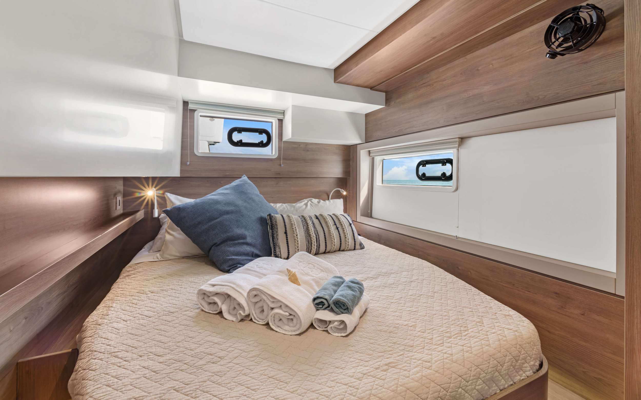 Guest Cabins: - 3 queen berth guest cabins - Each cabin includes a private en-suite electric head - Each cabin has a stall shower and sink/vanity - All heads have dry stall showers - Individual air-conditioning control in each cabin for personalized comfort Top Deck: - Fly-bridge with lounging, dining, and seating areas - 360-degree panoramic view Forward Cockpit: - Solid sun deck and dining area Aft Cockpit: - Seating and dining accommodations Main Deck: - Bright and airy main salon, fully air-conditioned - Direct access from the galley to the forward cockpit lounge area in true Bali catamaran style, the salon back wall lifts and side windows slide forward to open the entire space for an alfresco dining experience and panoramic views Crew Quarters: -Separate queen cabin and head for the crew BERTH SIZES: All queen berths are 5'w X 6'6"L