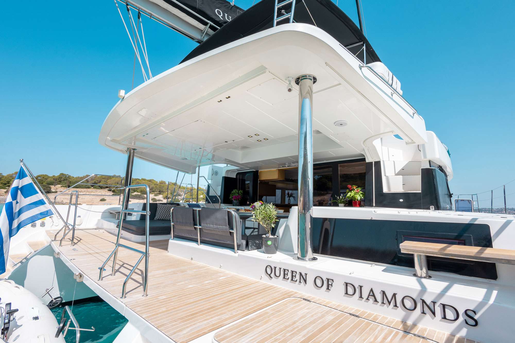 Queen of Diamonds is a Lagoon 52 with the superior extra of a flybridge, that creates a great area to relax, along with your captain while sailing. Queen of Diamonds practically has three different spaces for the guests to relax, these would be the cockpit, the forward saloon, and the flybridge. Equipped with all the amenities of a floating hotel, including air conditioning, generator, solar panels, comfortable cockpit cushions, sunbeds, electric heads, USB sockets in all cabins and saloon, 3 refrigerators, surely she will offer you a great vacation experience.