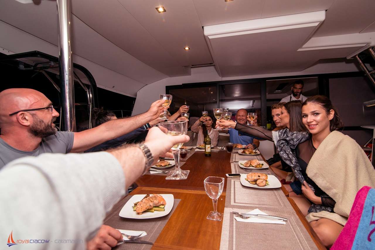 ROYAL CRACOW is one of the most luxurious and modern catamarans on the Adriatic Sea in size category 50 feet, managed by enthusiastic Slovak owners. In his category belongs to TOP 3 best catamarans in Croatia available for charter. In hotel terminology, this catamaran is a floating 5***** hotel. This elegant beauty on the water and with high levels of performance, also offers a splendid place to relax with its carefully crafted Lounge deck. This is integrated into the design process from the very beginning in order to give the craft its beautiful lines as well as the best possible levels of comfort, both at sea and at mooring. Motion on board has been designed to ensure privacy between saloon, front or rear deck or Lounge deck on the top floor. ROYAL CRACOW is ideal for multigeneration families, students and young people which wish to experience unforgettable sailing party. Alternatively it can perfectly fit for business partners arranging teambuilding for their clients and employees. To bring you feeling of exclusivity, uniqueness and novelty, we performed for you complete reconstruction of interior and exterior early 2025. S/Y ROYAL CRACOW FOUNTAINE PAJOT - SABA 50 6+1 BUILT 2017 / LOA 50FT 10 PAX / 5 CABINS 2 CREW/ 1 CABIN + 1 FRONT PEAK BASED IN TROGIR, CROATIA