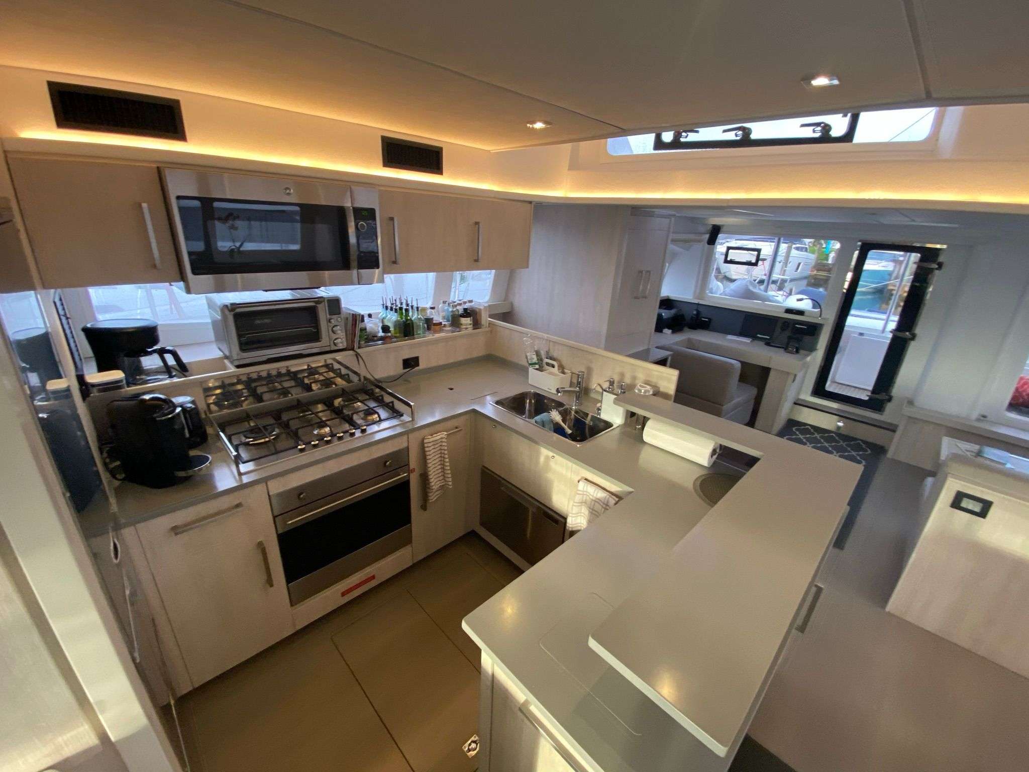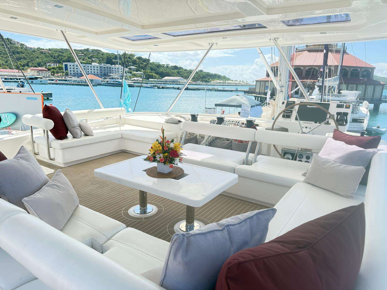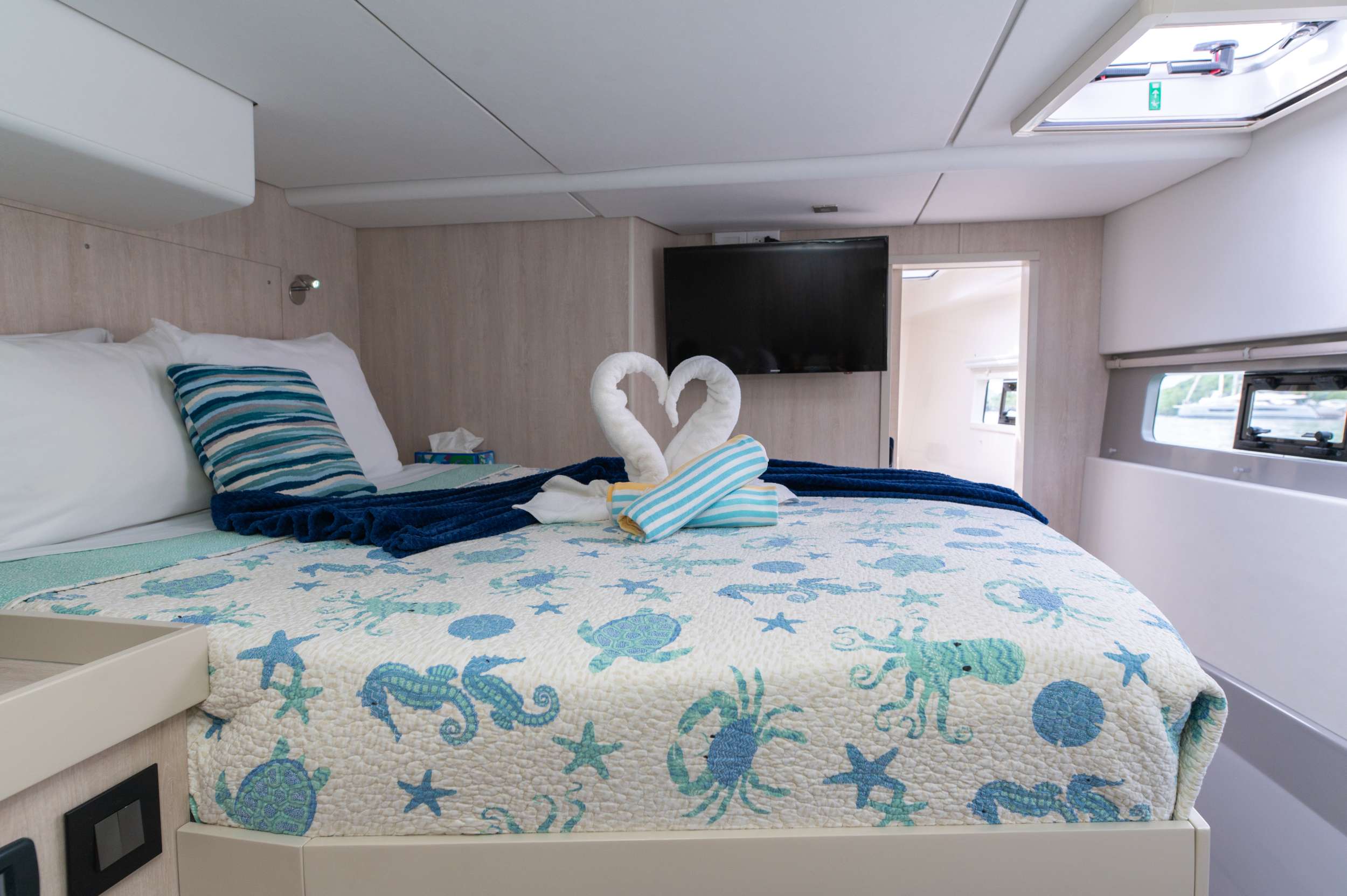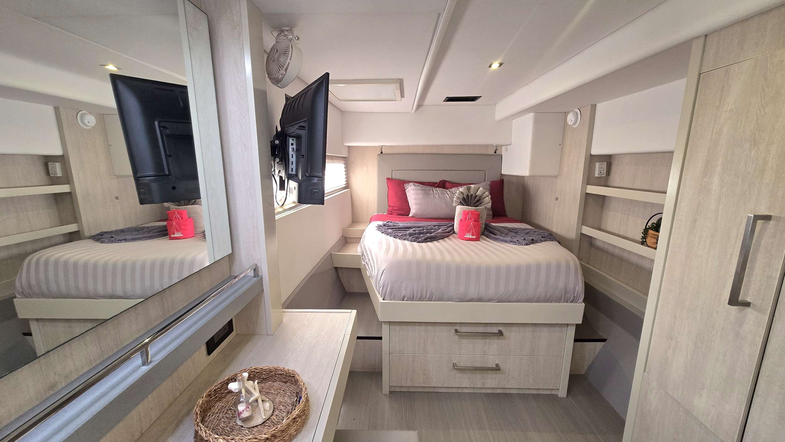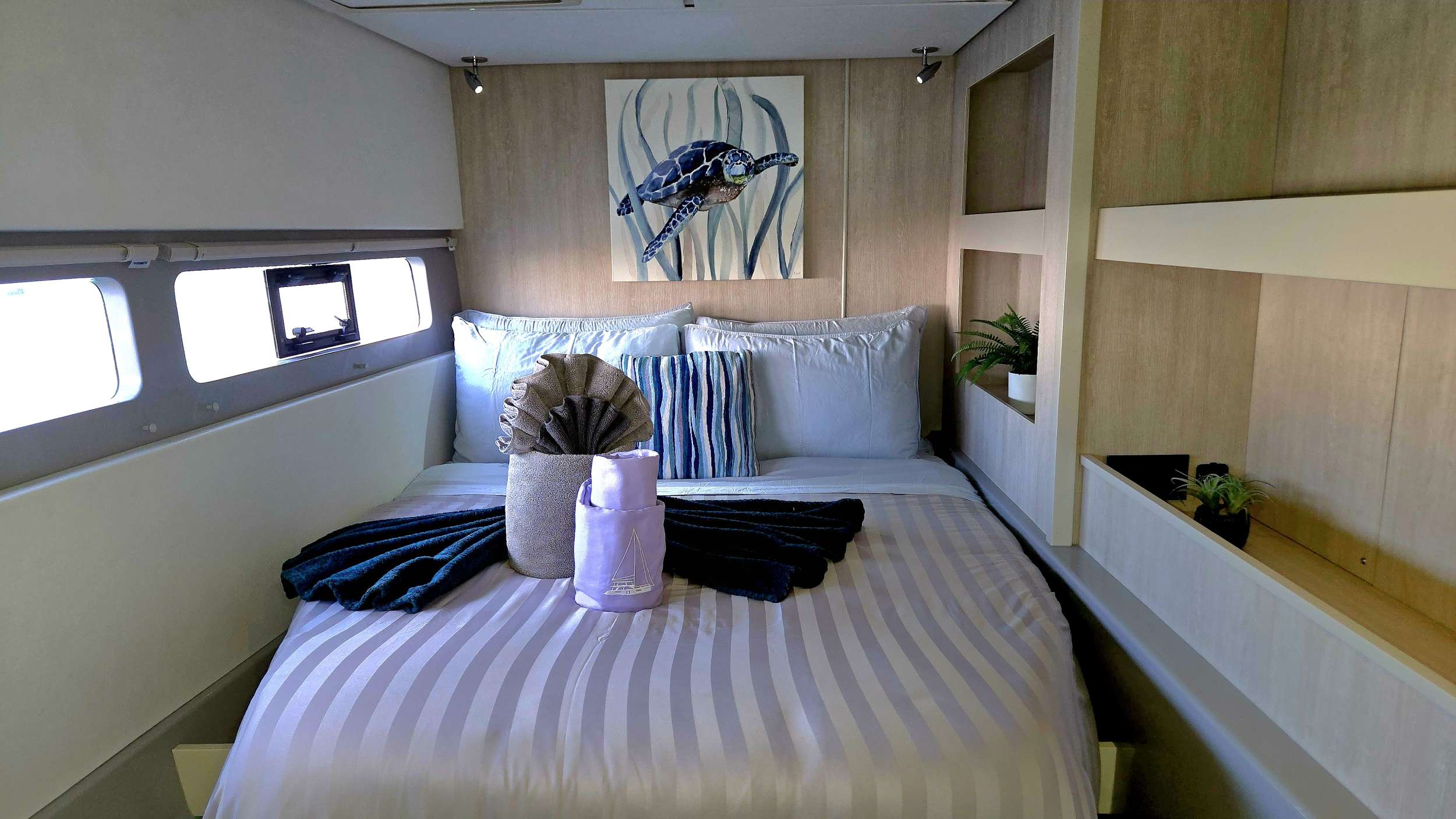 Ruby One features three queen-berth guest suites for discerning guests, and a bespoke extra-large main deck saloon. All guest cabin queen beds feature 3 inch foam mattress pads. The saloon is fronted by a private forward lounging cockpit. There's also a large flybridge lounging and helm area above. Dining is either in the saloon, or al fresco on the aft deck. Air-conditioned throughout.