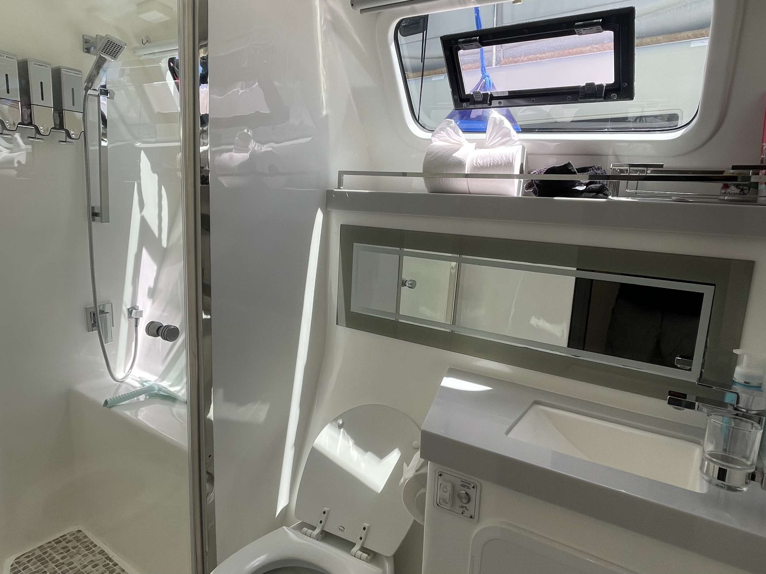 Accommodations include: 2 queen and 2 double berth cabins each with an ensuite head including dry shower stalls in three cabins (one has wet head), electric head and vanity. All cabins are fully air-conditioned plus have a fan. Cabins have own stereo system, TV with Apple TV's hooked up to a server with 300+ movies. Main salon has stereo plus TV and is fully air-conditioned. Aft deck cockpit with BBQ area plus very large bow for lounging. Berth measurements: Starboard Aft - 62" Wide & 75" long Starboard Mid - 54" Wide & 75" long Starboard Forward - 62" Wide & 75" long Port Aft - 56" Wide and 84" long