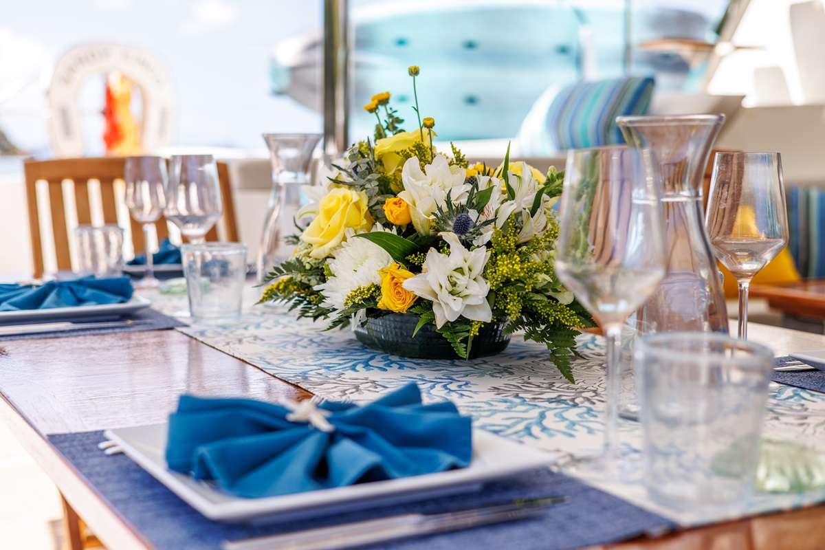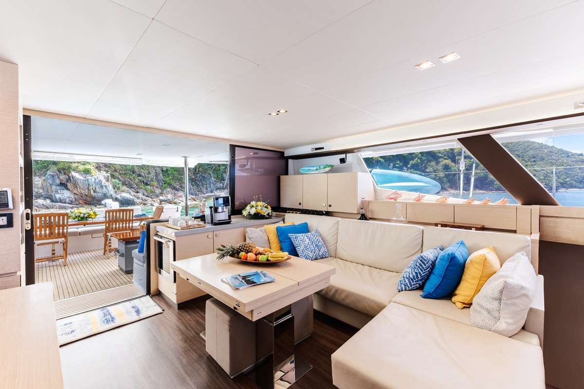 The bright airy interior of Sandy Cinco is bathed in natural light from her large windows and port lights. Sandy Cinco sleeps eight guests in 4 beautiful ensuite cabins: the king-size primary suite and three queen VIP suites. All the cabins have low island beds with mattresses on sprung bases, memory, foam toppers and high-quality bedding to provide the utmost comfort. Each cabin has temperature controlled air-conditioning and ensuite bathroom, including electric head, vanity unit, separate shower and complimentary toiletries. Silent Night technology means you can experience a completely quiet atmosphere while you sleep, with the soothing comfort of air conditioning guaranteeing a peaceful night. The spacious saloon features a large adjustable height coffee table and a seating area that's perfect for a movie night or watching Lizzy prepare her delicious meals. The cockpit comfortably houses the adjustable alfresco dining table and a coffee table alongside two sunbeds and plentiful seating overlooking the sea. The fully covered flybridge is almost entirely for guest relaxation with comfortable shaded benches close to the drinks fridge and the bar and offers wonderful views when sailing or at anchor. At the bow there are two more sunbeds, beanbags, dolphin seats and brand-new trampolines for soaking up the sun.