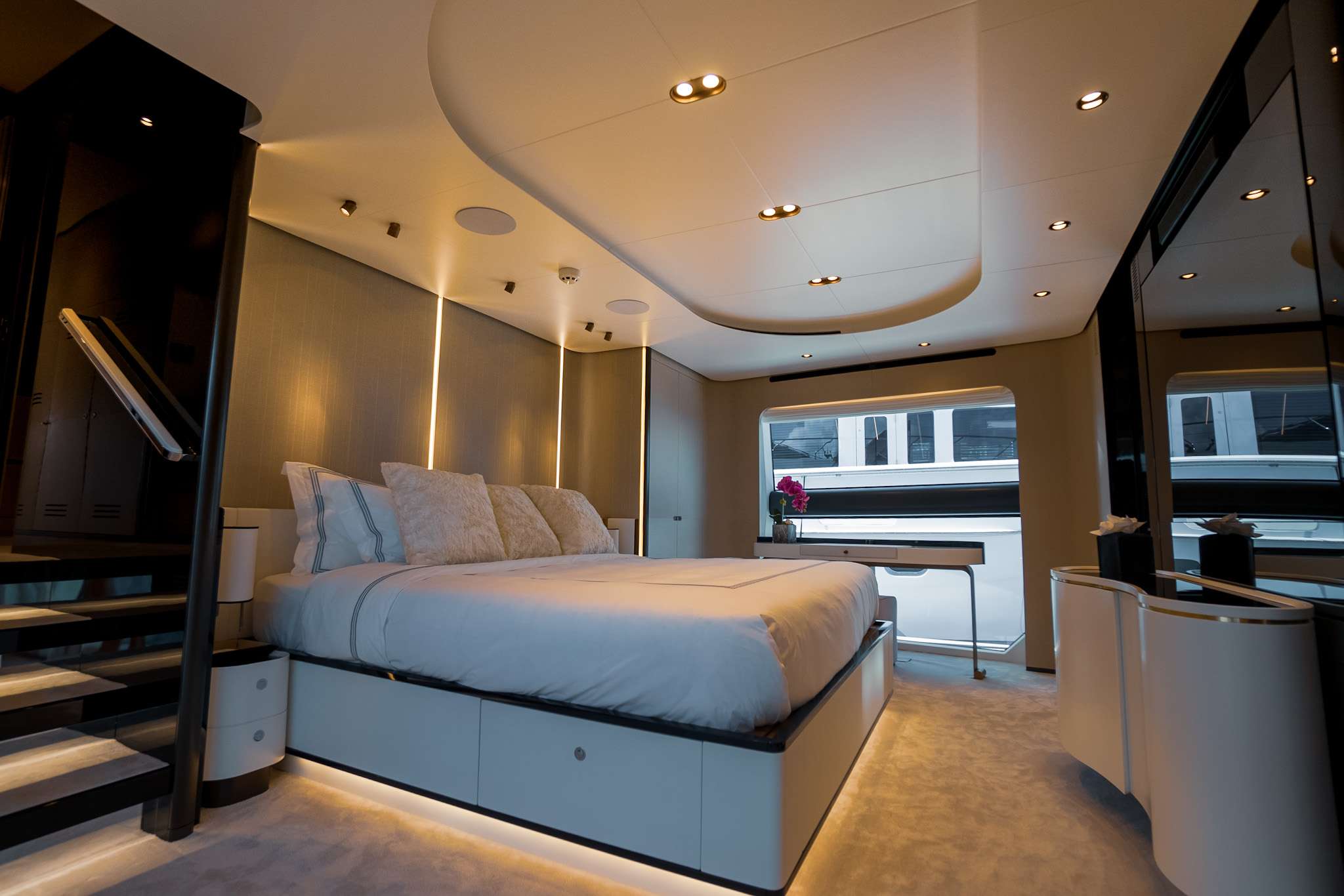 Master stateroom on main deck with oversized windows offering endless views. To port is a desk for working on the go, the mirrored wall separating the ensuite hides the large television when not in use. Forward of the bedroom, accessed via steps reveals an oversized, marble clad ensuite with double sinks, large standing shower with bench and private toilet. Her lower deck hosts four staterooms including two identical queen staterooms situated aft and two convertible staterooms forward. All offer generous windows and ensuite facilities.
