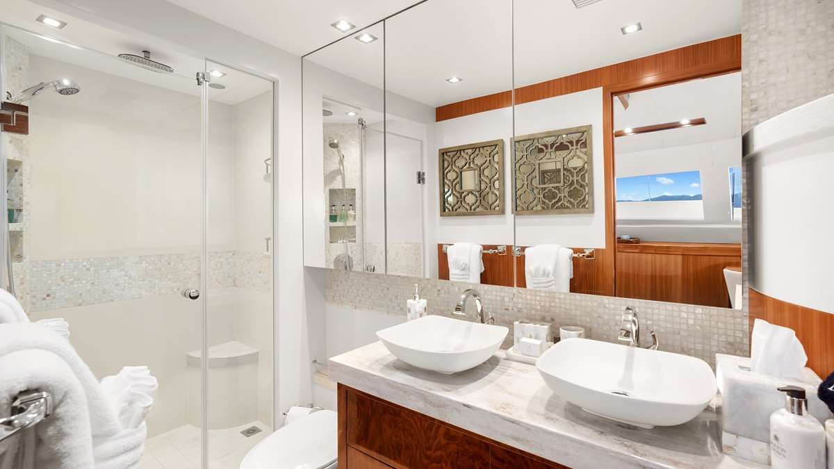 SEAGLASS 74 offers her guests bespoke comfort and room in a main-deck primary king suite, two forward king suites, and an amidships convertible twin -OR- king suite.