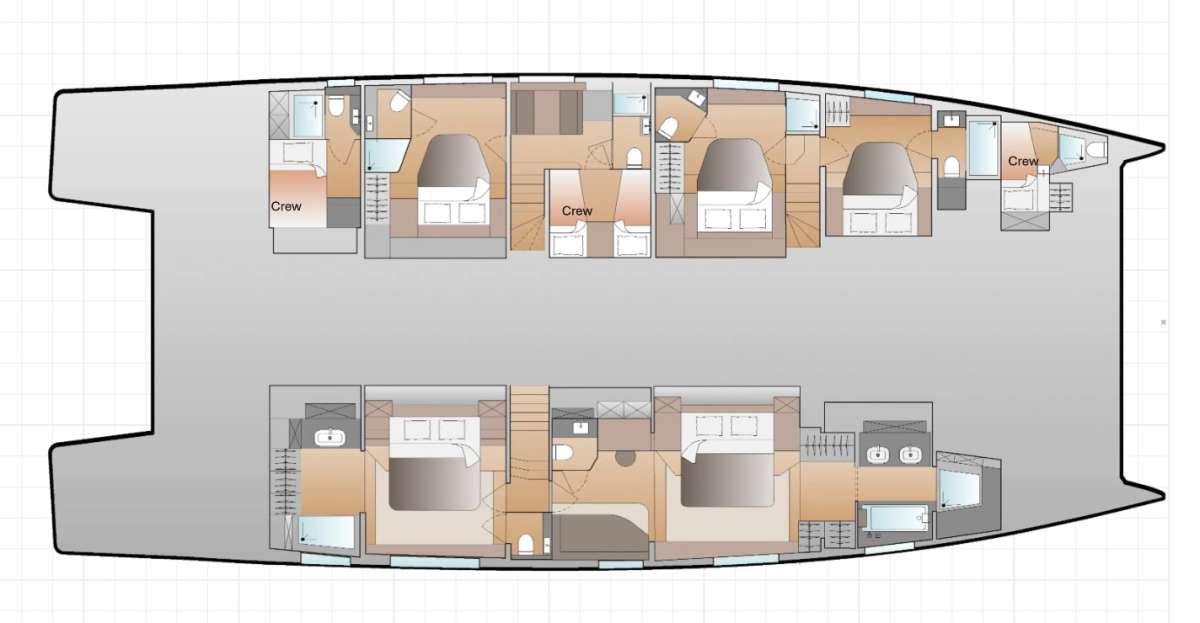 One owner's suite with jacuzzi bathtub and separate shower (bed size 1,80 m x 2,00 m), one VIP cabin with desk area (bed size 1,80 m x 2,00 m), and three queen bed cabins (bed size 1,60 m x 2,00 m), all with private facilities.