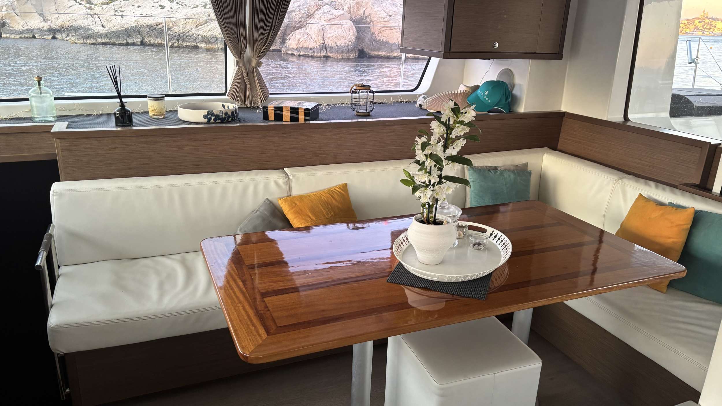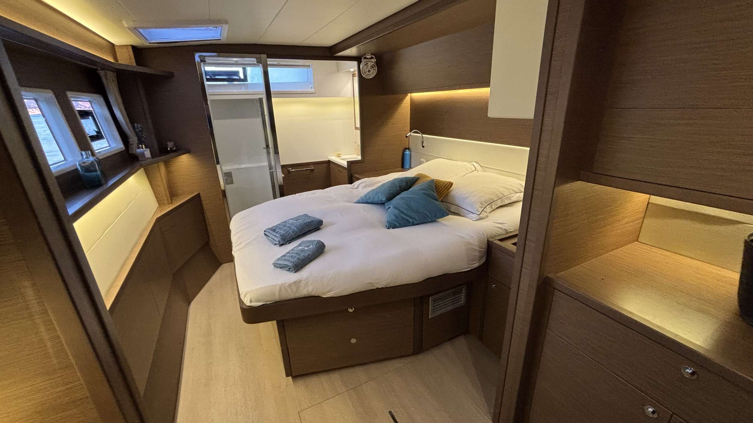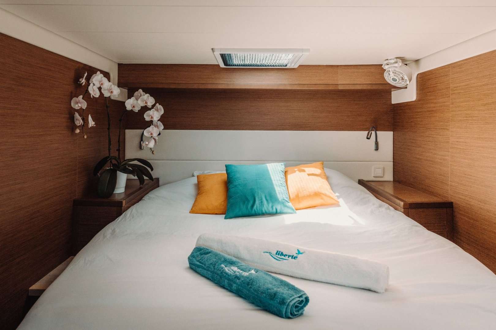 Lagoon 52 Sérénité boasts spacious volumes and great habitability for an outstanding life on board and ideal size for accessing secluded bays and coves. Her spacious exterior deck offers plenty of sunbathing space. The 4 double cabins, with ensuite bathrooms, are bathedin light thanks to the large portholes along the hulls.