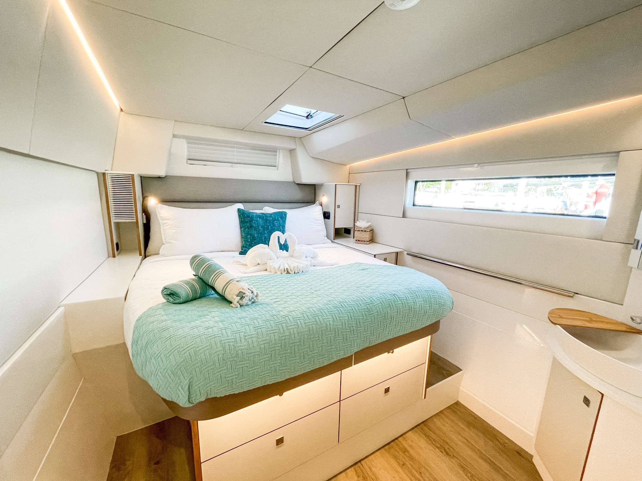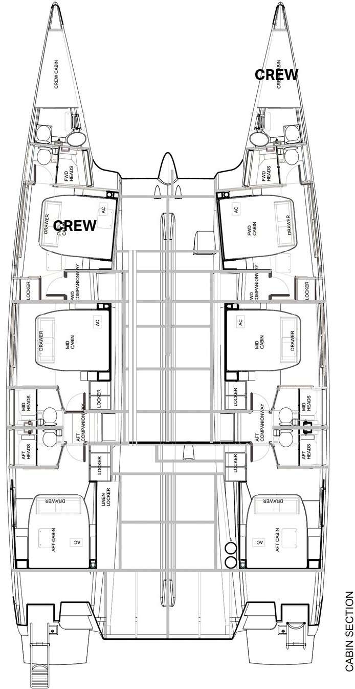 Cabins feature ample storage with drawers, lockers, and space under the bed for soft luggage. Each cabin is decorated in shades of Caribbean blue and feature underwater photography taken by SEVEN's owner.