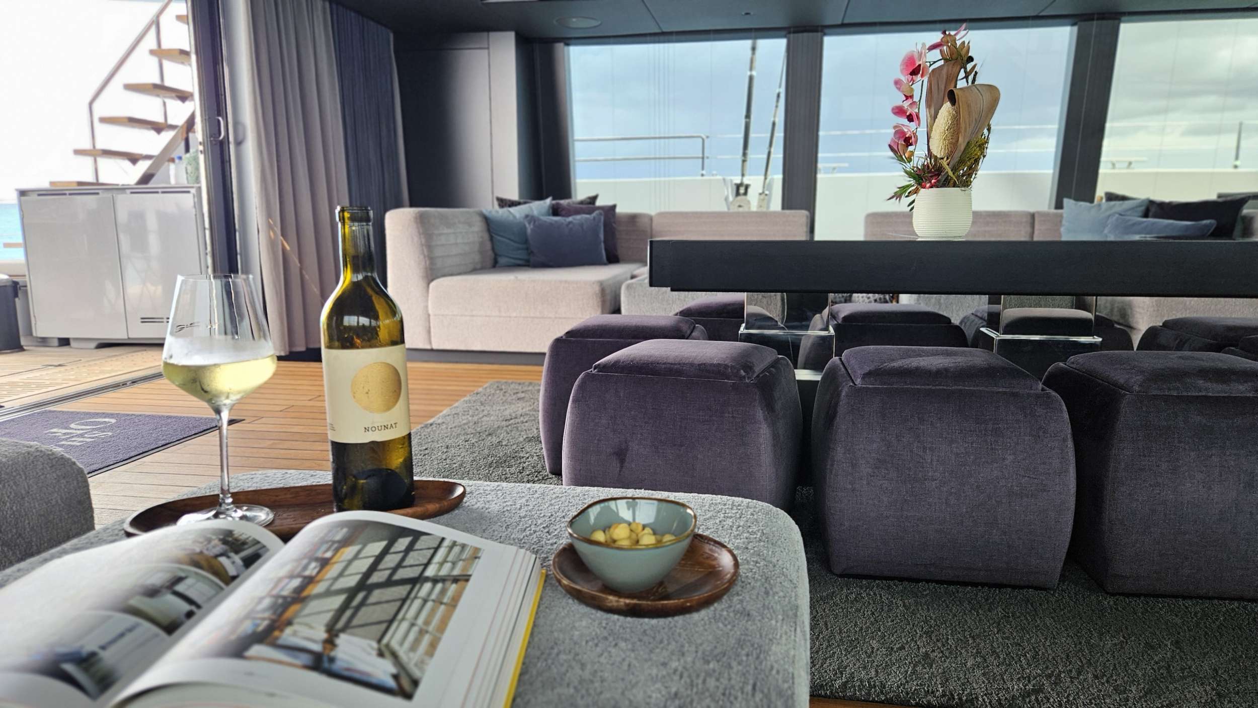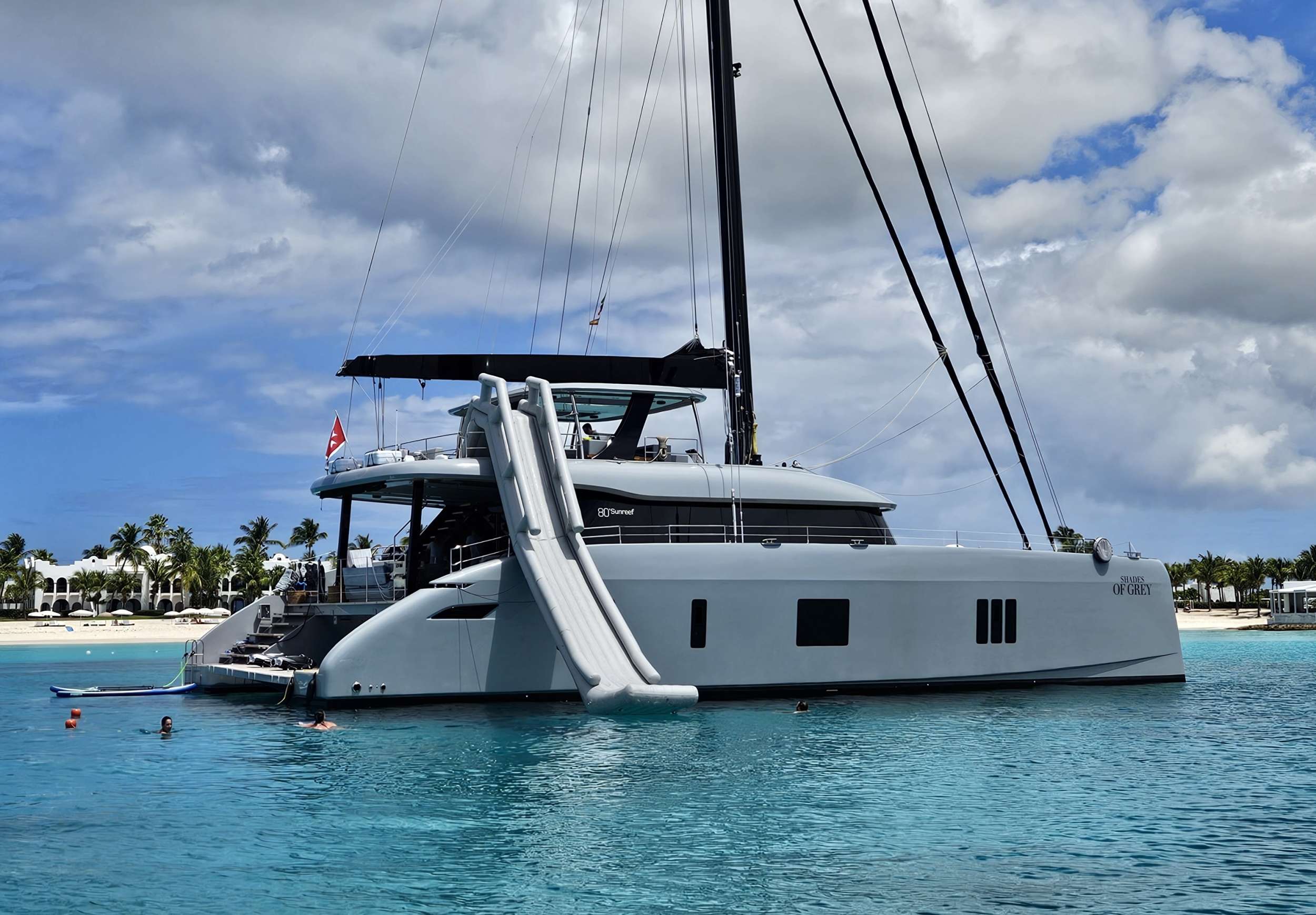 If you had to describe the Sunreef 80 SHADES OF GREY in one sentence, you would say that this Sunreef 80 impresses with its clean, elegant design and is truly no 'grey mouse'. Warm shades of grey, combined with a modern green, give the interior a fresh and very elegant look. You will immediately feel at home on board as there are no 'loud' design elements to obstruct the view and everything is simply harmonious. The master cabin is located in the middle of the starboard side and has a king-size bed, a small sofa for relaxing, a dressing table and a walk-in wardrobe. The bathroom with shower is very spacious. Also to starboard is the double cabin (queen size bed) with a comfortable en suite bathroom. On the port side, amidships, is the VIP cabin (queen-size bed), which is slightly larger than the double cabin and has a walk-in wardrobe. The bathroom is also slightly larger. Forward on the port side is the guest cabin with three comfortable single beds and an en-suite shower room. The beds are 80 x 200 cm and the bunk beds are staggered so that the upper bed is easy to reach. The saloon is all about relaxing together, with two really big lounge sofas. In the centre is a black glass table that can be converted into a dining table for up to 10 people in bad weather. The aft deck has a large dining table that can seat up to 10 people and a lounge sofa. There is also a lounge with a coffee table on the foredeck. On the flybridge, the SHADES OF GREY has another large dining table, perfect for up to 10 guests, with a U-shaped seating area. Behind this is a full width sunbathing area. Forward of the helm position is an attractive bar, where you can enjoy a drink or have a snack from the chef. The flybridge is transformed into a spa area when the stewardess sets up her massage table and pampers guests with a feel-good massage. There is also a wide range of water sports on board, including an E-Foil, two Seabobs and numerous other water toys, as well as a water slide. And it's not just the kids who have fun!