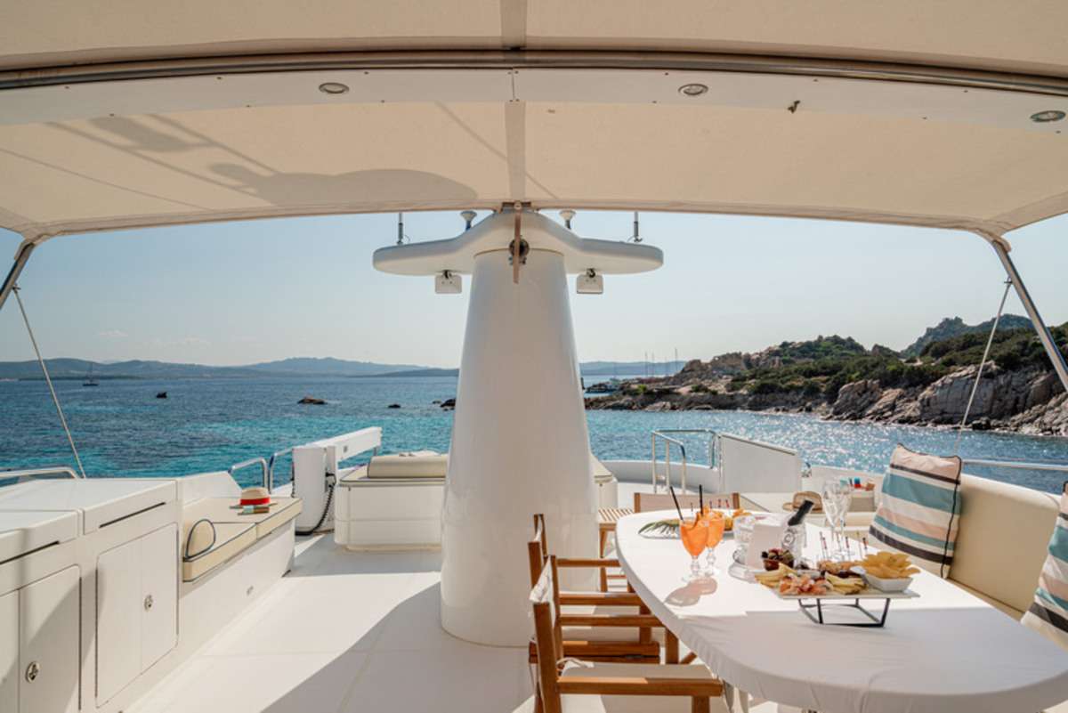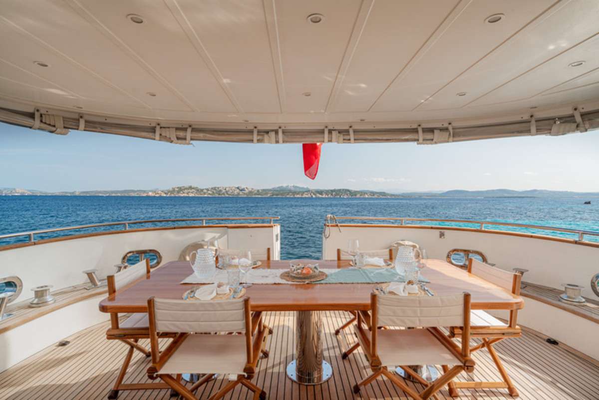 Shangra is a beautiful 26 meters navetta with a classic and elegant design. Access from the main deck goes through a beautiful outdoor dining area, and then continues into the main salon with a lounge area including sofas and a TV and, further, a separate indoor dining area. The kitchen is really wide for a yacht of her size and allows the crew to prepare elaborate culinary creations and to perfectly manage the refreshments service. The lower deck houses the sleeping area divided into: a master cabin with a large double bathroom; a VIP suite with private bathroom; one double cabin with separate beds, all cabins are equipped with ensuite facilities. The most enjoyable outdoor area of the yacht is definitely the sundeck, equipped with solariums, an additional outdoor dining option for 12 and a kitchenette with wetbar and grill. Thanks to high quality Naiad stabilizers, Shangra guarantees a quiet and pleasant cruising.