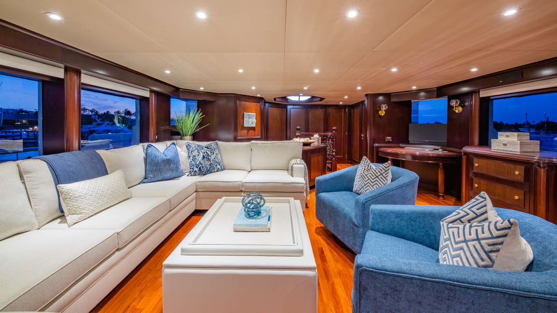Starship's major refit in 2004 and continued upgrades into 2020, have her showing like new. She sleeps twelve guests in 5 staterooms each with en-suite bath. There are also an additional 2 day heads for guest use. She is decorated throughout with rich mahogany wood, elegant marble finishes, fine art and elegant soft goods. The side entrance welcomes guests into an impressive main foyer. The main salon is arranged with a full bar, two sitting areas, one area with a semi circular settee facing the 52" flat screen TV and entertainment system, the next area with inviting sofa and oversized chairs, and the most aft to port set with a game table. The private formal dining is forward with a round table which comfortably seats 10. The fine china, detailed cabinetry and superb view forward provide an intimate and memorable dining experience. The skylounge area is a great alternative for intimate cocktails and entertaining, or simply to escape to a quieter place for a bit of work at the desk or relaxation in the cozy sofa or chairs. The Master suite is located amidship on the lower deck and features a California King size bed, full seating area with sofa and chairs, large walk-in closets with dressing area and elegant en-suite marble accented bathroom with steam shower. There are four additional staterooms aft of the Master including a Queen VIP with pullman and sofa bed, two mirrored guest staterooms set with King sized beds and a Twin guest stateroom to starboard. Each stateroom is ensuite with head and shower and fully equipped with flat screen TV, DVD and CD. Aft of the skylounge is a large square al fresco dining table for 12 guests serviced by a full bar to starboard. Up one level to the flybridge deck, guests can enjoy the jacuzzi, plenty of comfortable sunning areas and seating, wet bar and surround sound music.