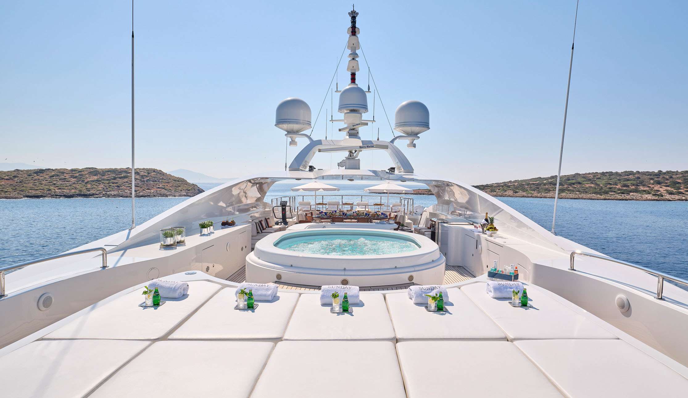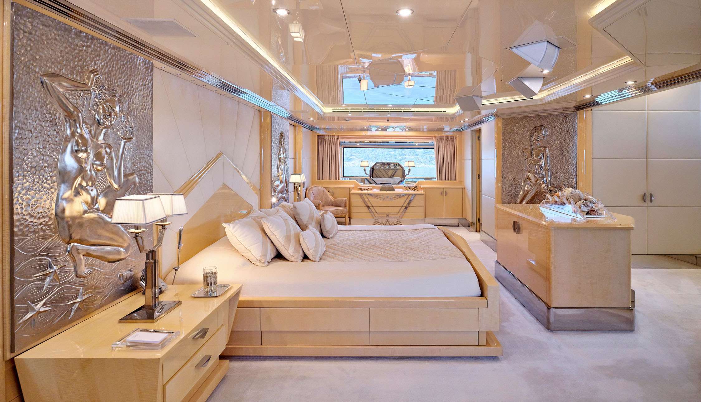1 x Master Suite with owner's study, king size bed (his and her bathrooms) and full beam sitting area, located on the main deck. 1 x VIP Stateroom with queen size bed located on the upper deck 2 x VIP Staterooms with queen size bed located on the lower deck 2 x Twin Staterooms with an extra pullman berth each, located on the lower deck