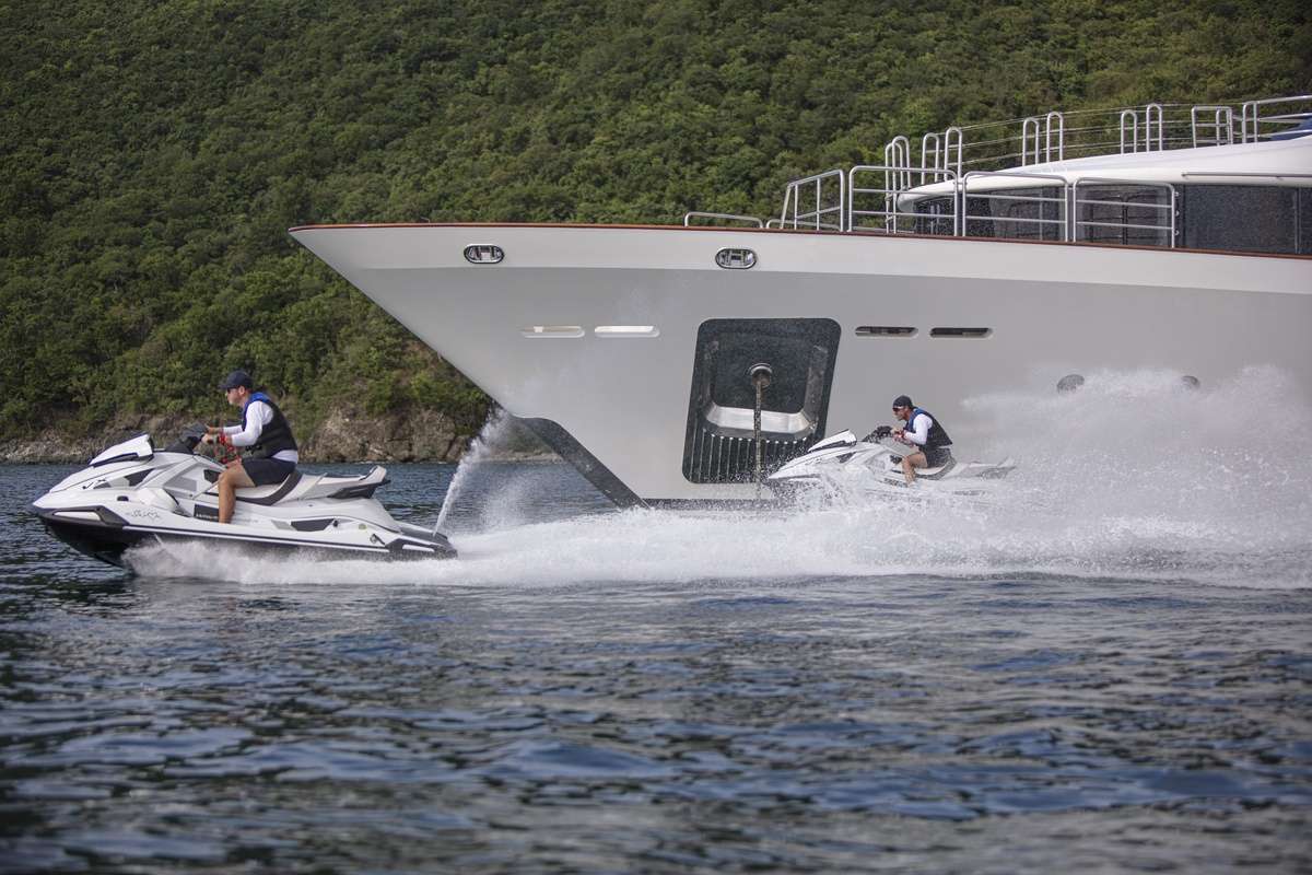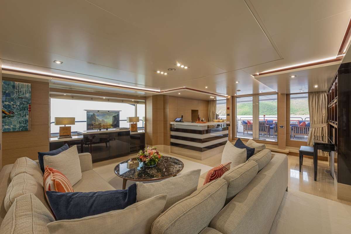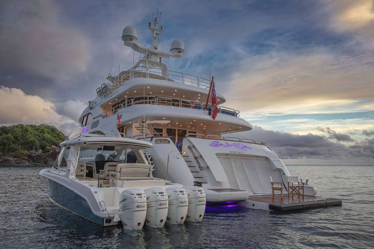 SUR LA MER is a striking 43.6m luxury superyacht crafted by the renowned Benetti shipyard in Italy. This opulent vessel boasts an elegant interior featuring limed oak panels, high-gloss wenge, and vibrant aqua blue accents. Accommodating up to 12 guests, SUR LA MER offers five exquisite cabins. The full-beam master suite, located on the main deck, is a masterpiece of design with its own office and lounge area, a spacious walk-in wardrobe, and a breathtaking en suite bathroom complete with a soaking bathtub. The master suite also provides direct access to a private foredeck terrace with inviting seating and a Jacuzzi. On the lower deck, there are four beautifully appointed guest cabins: two expansive VIP suites, one double cabin, and one twin cabin, each with additional Pullman berths perfect for children, and all featuring luxurious en suite shower rooms. The bridge deck sky lounge is a standout feature, offering cozy seating areas divided by a stylish bar. This lounge flows into a formal dining area encased by circular sliding doors, which can be opened to enhance the alfresco dining experience. One of SUR LA MER's most captivating features is the generous sun deck. Here, an oversized Jacuzzi is the centerpiece, complemented by sun loungers, cushioned sun pads, and a large dining table ideal for relaxed outdoor meals. The space is a guest favorite, with optional shade ensuring comfort at any time of day. For added convenience, the yacht is equipped with two tenders for swift trips ashore and access to a variety of water toys, including jetskis, a wakeboard, and an assortment of towable inflatables. This ensures that guests of all ages can enjoy fun-filled days from sunrise to sunset
