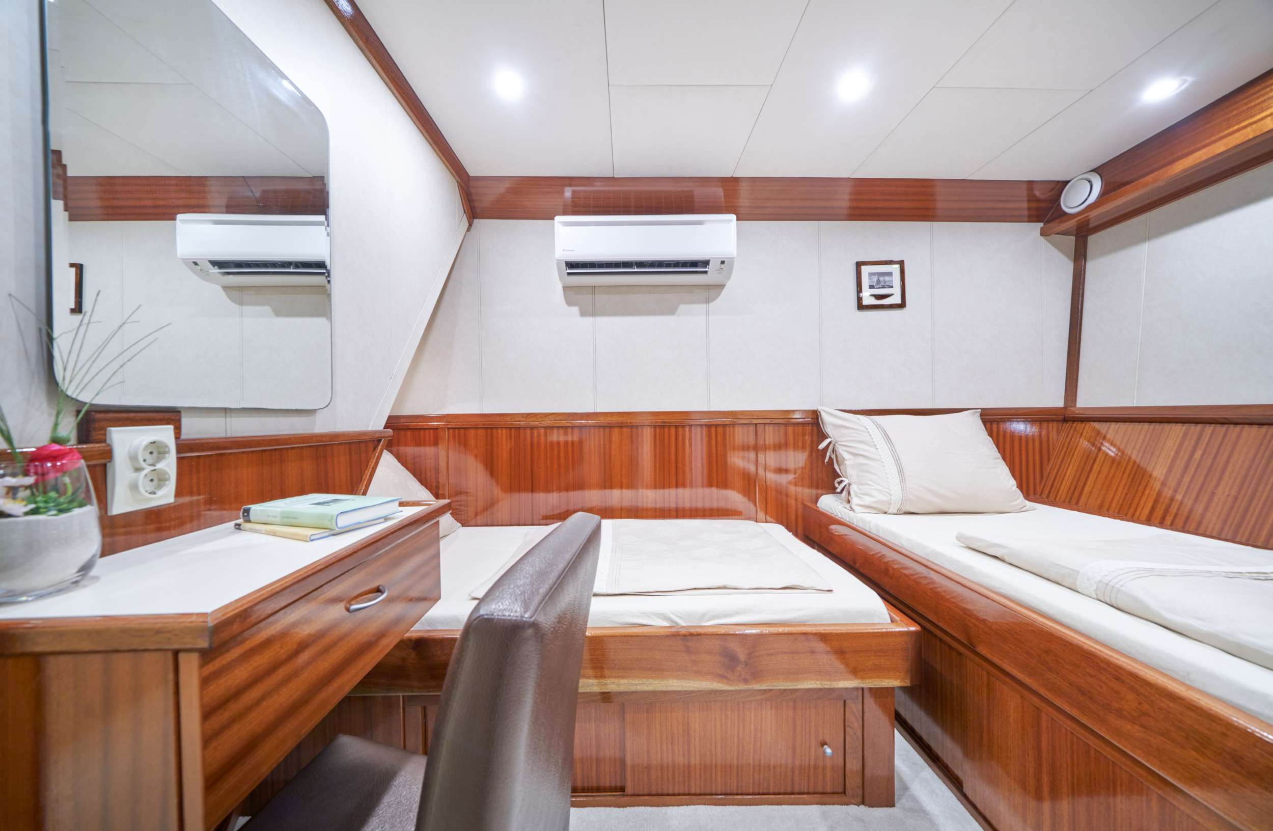 9 cabins: 1 convertible bed cabin on upper deck 4 double bed and 4 twin bed cabins on lower deck
