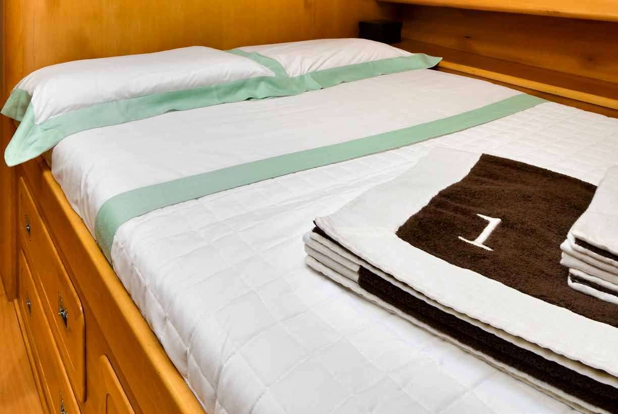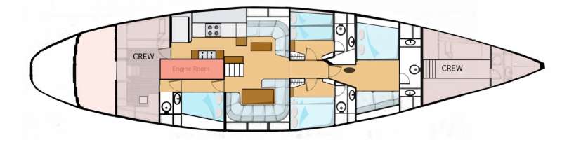 In case of family groups, 8 beds are available. Charterers must be aware that Tess is a pure sailing vessel Forward double bedded cabin with bathroom ensuite, 2 twin cabins each with lower and upper beds and own bathroom. It is possible to have also a 4th cabin, situated in the rear part of the vessel, close to the crew's area: it is a single cabin, but with a comfortable bed (double French size) wich could accommodate 2 young's (with own bathroom). Very bright and well refurbished saloon, separated galley. Crew's quarter with indipendent access from cockpit Flush deck, spacious teck deck completely rebuilt in 2012