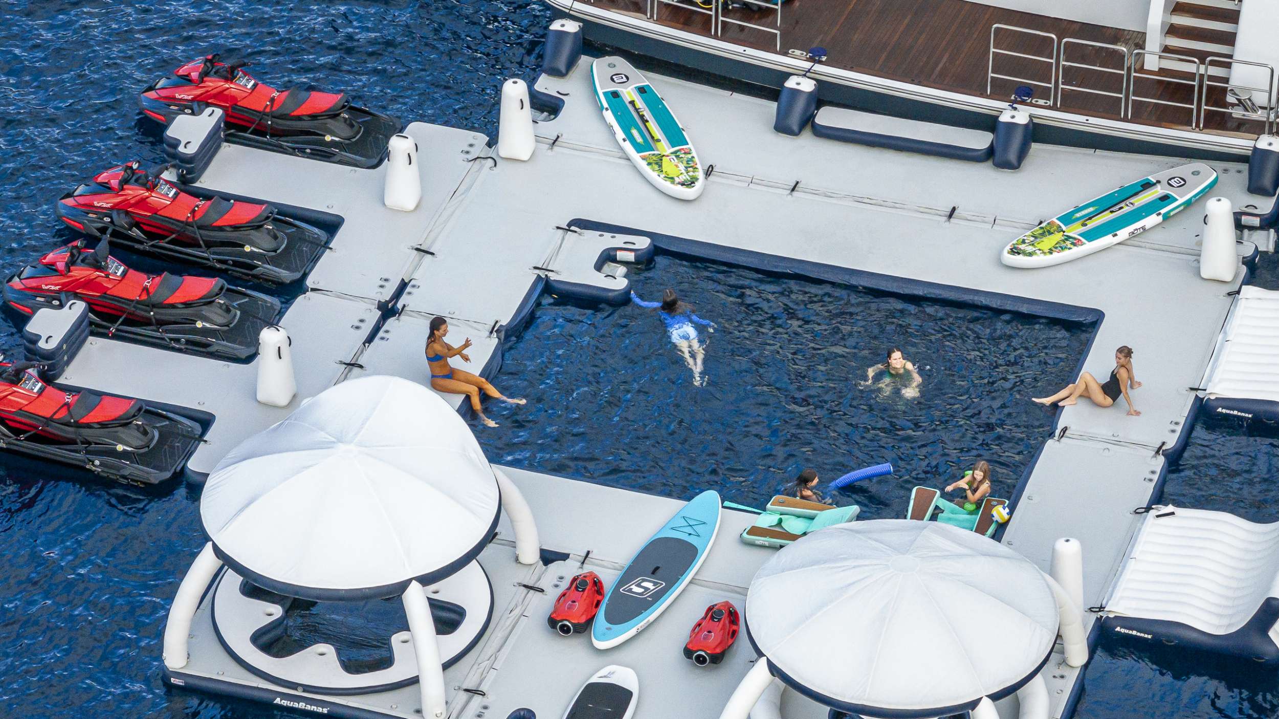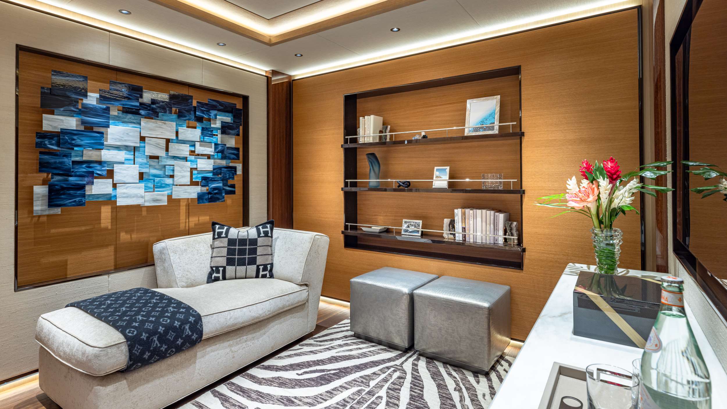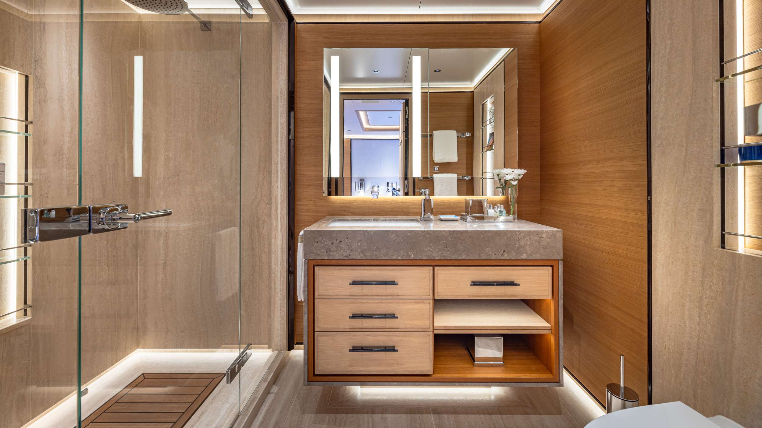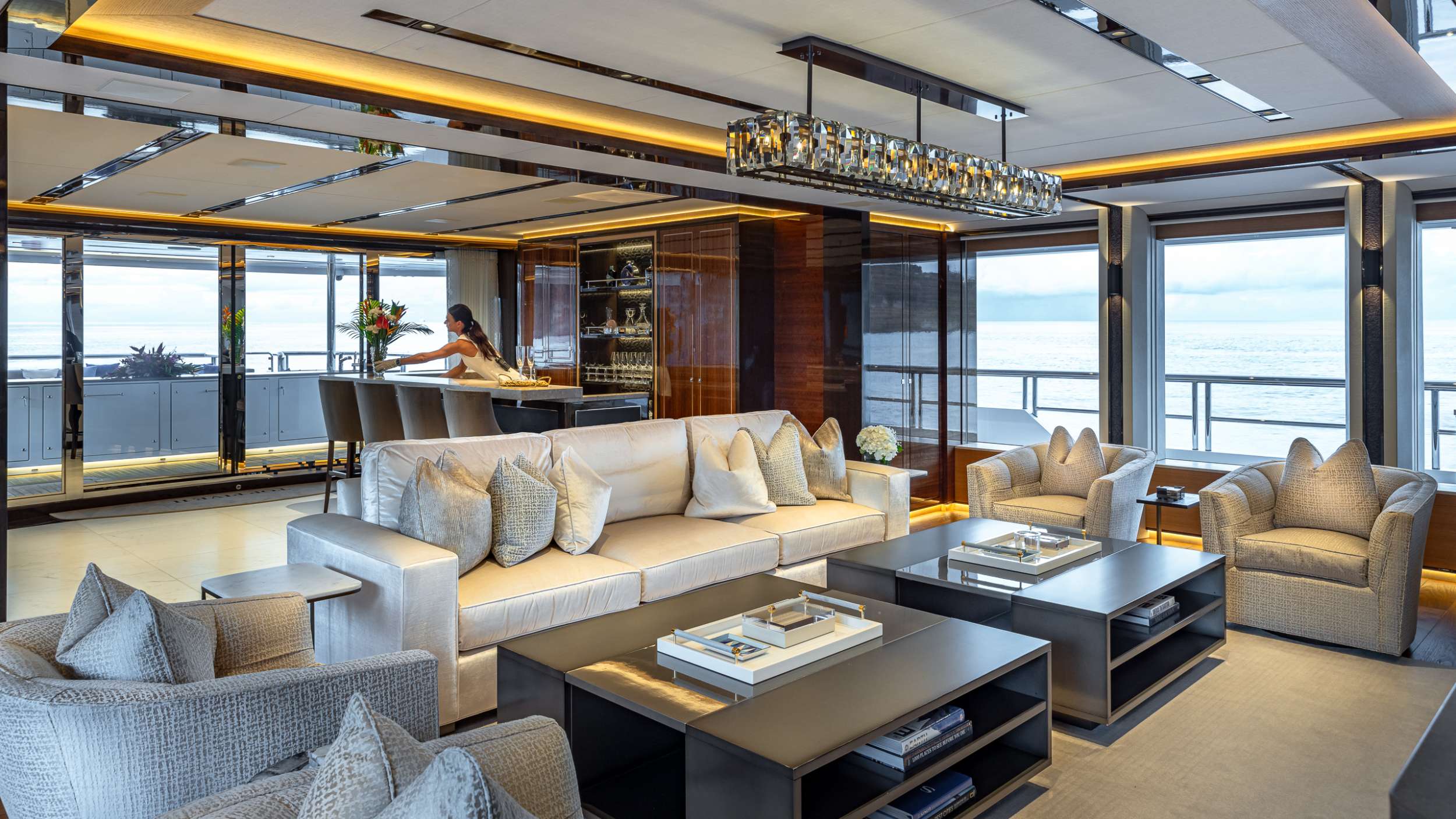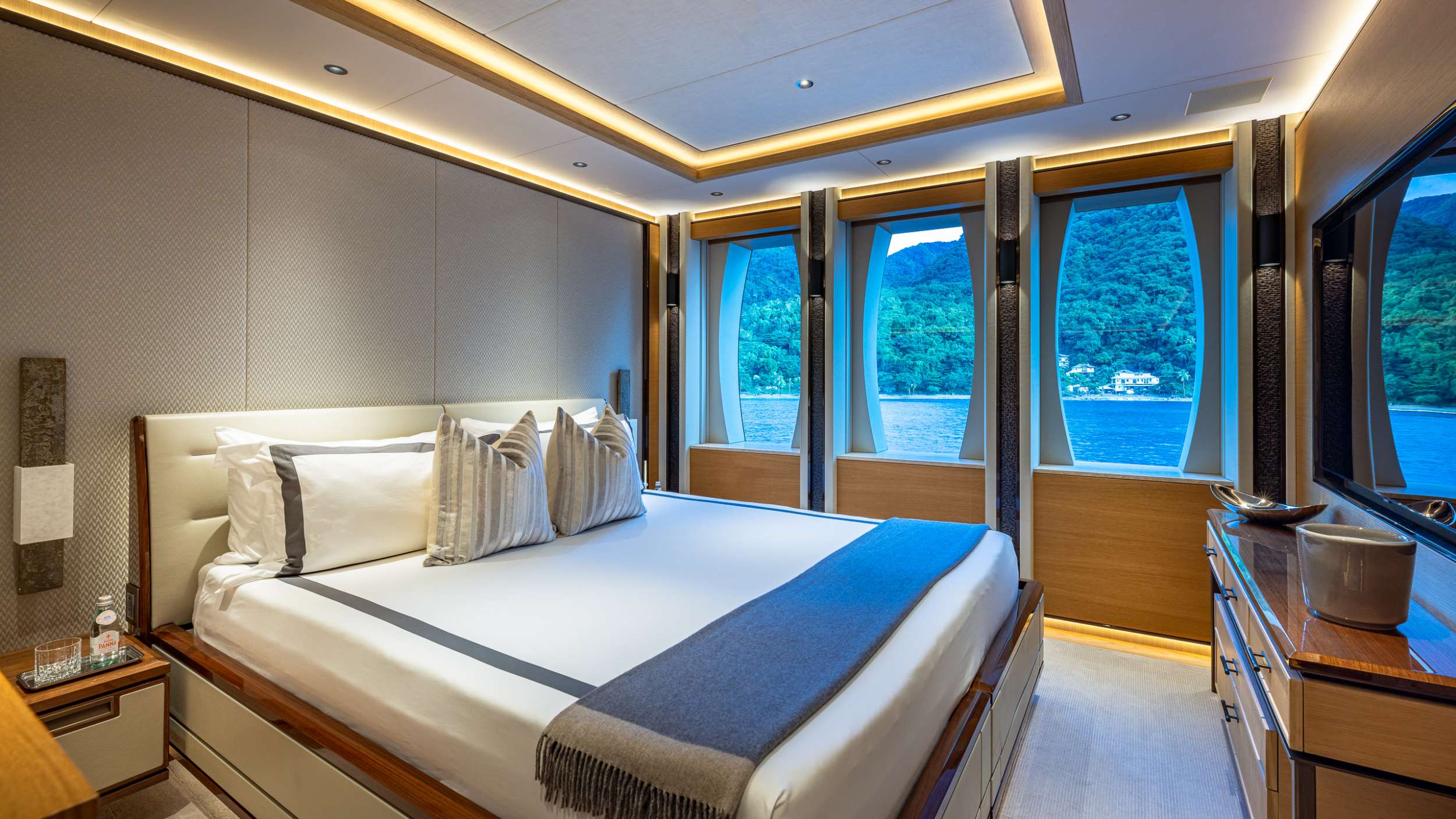 Amassing an impressive length of 200'2" (61m), the Royal Hakvoort yacht offers an array of standout amenities and reinforced hull, and immense ceiling heights throughout. Seven well-appointed guest suites and a dedicated owner's deck provide plush accommodations for 12 onboard guests. TOP FIVE II's voluminous interior was designed by Sinot Yacht and Architectural Design. Interior elements emulate warm and rich emotions by utilizing oak, walnut, and leather complemented with Italian marble and rich fabrics. Higher ceiling heights allow for larger windows, flooding the interior with natural light. The Royal Hakvoort living spaces were designed with entertaining in mind. Formal dining areas are featured throughout the yacht. The galley is an open, socially-oriented space, that is also properly adapted for the onboard chef. A glass elevator reaches all decks onboard, transporting guests to any of the 5 decks. The dedicated owner's deck features a private dining area and a foredeck jacuzzi for privacy and relaxation. The large king bed is surrounded by 180-degree floor-to-ceiling windows allowing sunlight to illuminate the suite. Additional guest rooms offer convertible spaces to fit any combination of families, friends, or corporate charters. Each stateroom features large windows, providing a stunning view from every angle. One stateroom is wheelchair accessible. TOP FIVE II is also equipped with Starlink Maritime.