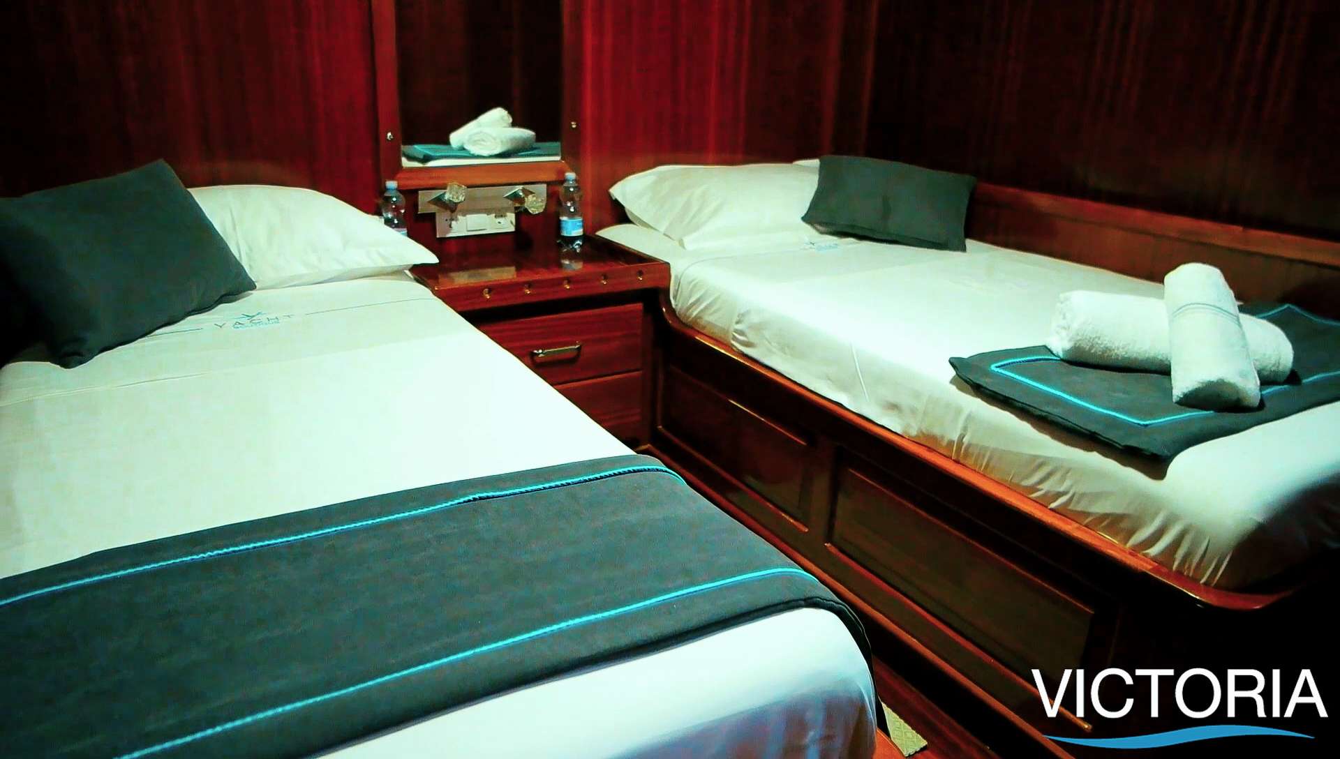 Victoria can accommodate 12 guests in comfort, with two master cabins, one twin-bed cabin and three double cabin. • 1 Master Cabin - 20 m2 cabin with double bed (160*210 cm). Private bath-room (3.5 m2) with shower box and home toilet. • 1 Vip cabin - 17,5 m2 Private bathroom (3.5 m2) with shower box and home toilet. • 3 Double Cabins 7 m2 cabin with double bed. Private bathroom (3.9 m2) with shower box and home toilet. • 1 Twin Cabin - 9 m2 cabin with twin bed. Private bathroom (3.9 m2) with shower box and home toilet. Beds: - Master e Vip 1.70 x 205 - Double bed cabins 170 x 200 - Double bed cabins twin 80x200 + 90x200 Equipments: Tender 5.90 plus outboard of 90HP 2 x canoes 4 x Sup ( Stand up Paddle) Snorkeling Equipments, Nautical Skii ,ringo ecc • 1 Master Cabin - 20 m2 cabin with double bed (160*210 cm). Private bath-room (3.5 m2) with shower box and home toilet. • 1 Vip cabin - 17,5 m2 Private bathroom (3.5 m2) with shower box and home toilet. • 3 Double Cabins 7 m2 cabin with double bed. Private bathroom (3.9 m2) with shower box and home toilet. • 1 Twin Cabin - 9 m2 cabin with twin bed. Private bathroom (3.9 m2) with shower box and home toilet. Beds: - Master e Vip 1.70 x 205 - Double bed cabins 170 x 200 - Double bed cabins twin 80x200 + 90x200 Equipments: Tender 5.90 plus outboard of 90HP 2 x canoes 4 x Sup ( Stand up Paddle) Snorkeling Equipments, Nautical Skii ,ringo ecc