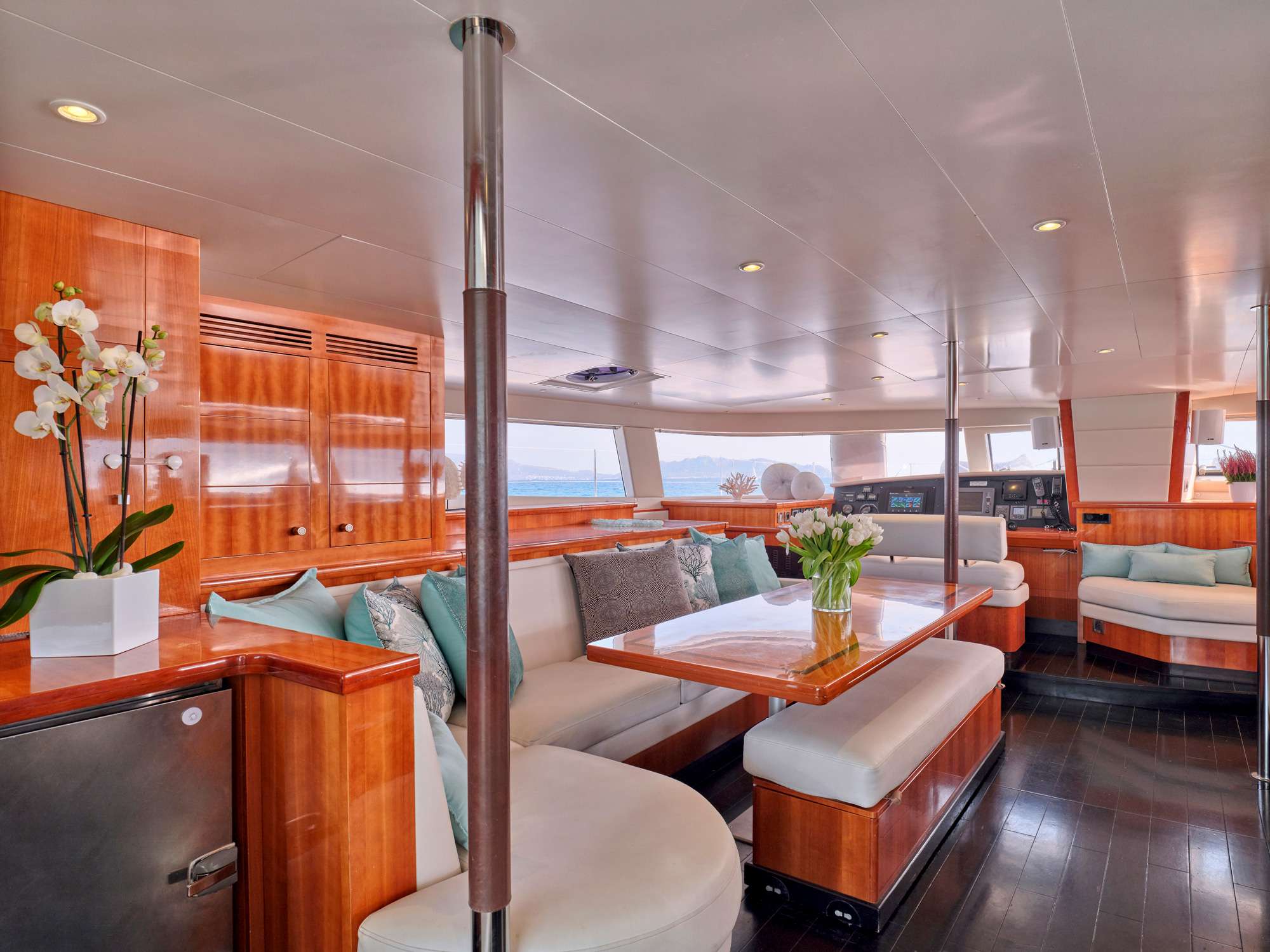 WORLD'S END is a Fountaine Pajot Galathea 65 and a boat to fall in love with. The absolute best-seller in our fleet is not without reason the most requested vessel for repeat customers. Having undergone a total refit in 2016 she looks more beautiful than ever. Its stylish design, decorated with colorful cushions puts you in a playful, though relaxed mood throughout your journey. This sailing yacht catamaran was built to highest industry standards to guarantee your safety and comfort under all circumstances. The moment you set your foot on board, you will be overwhelmed by the luxurious and translucent interior, by the comfortable and spacious cabins, the relaxing atmosphere of the deck areas, the intriguing variety of water toys and most of all the amazing service of the WORLD'S END crew, who will make you feel extravagantly spoiled in every way. Accommodating up to 10 guests, in one King size cabin, three Queen size cabins and one twin cabin, all equipped with private bathroom facilities, it is perfectly suitable for sublime vacations with your family or friends. The aft deck will make you feel like sitting on the private terrace of your summer bungalow, enjoying the tranquility and comfort, either having a deliciously prepared meal, created according to your desires by your Chef with a vast variety of Mediterranean flavors, either simply relaxing and blending in with the amazing environment your Captain will have taken you to. The sailing catamaran WORLD'S END will bring you to the most beautiful places in the Mediterranean while traveling in all comfort and privacy. Guided by her crew you will yourself discover the magnificent islands, nature and culture. If you feel like maintaining your daily exercise and to digest the delicious meals, (you probably will gain a few pounds), there are numerous water toys waiting for you, which are going to make you feel like playing in your own amusement park, whether you are being towed on a tube, banana, or water-skis, paddle boarding, wake boarding or having a small trip in the kayaks, or living the ultimate experience of diving with one of the sea-bobs. If you've ever used a sea-bob before, you know what it feels like. During the hours between meals and playing in the crystal blue waters, you can either relax sunbathing on the comfortable mattresses on all decks, play with the dolphins, who often swim alongside the boats in Greece, or simply and harmoniously savour the dreamlike scenery during a sunset, whilst sipping a cocktail or a glass of champagne on the cozy upper deck. WORLD'S END will take you on a journey that will not easily be forgotten. The itinerary, activities and the menu will be based on your input and preferences to guarantee you and your guests will have a unique experience to cherish long after.
