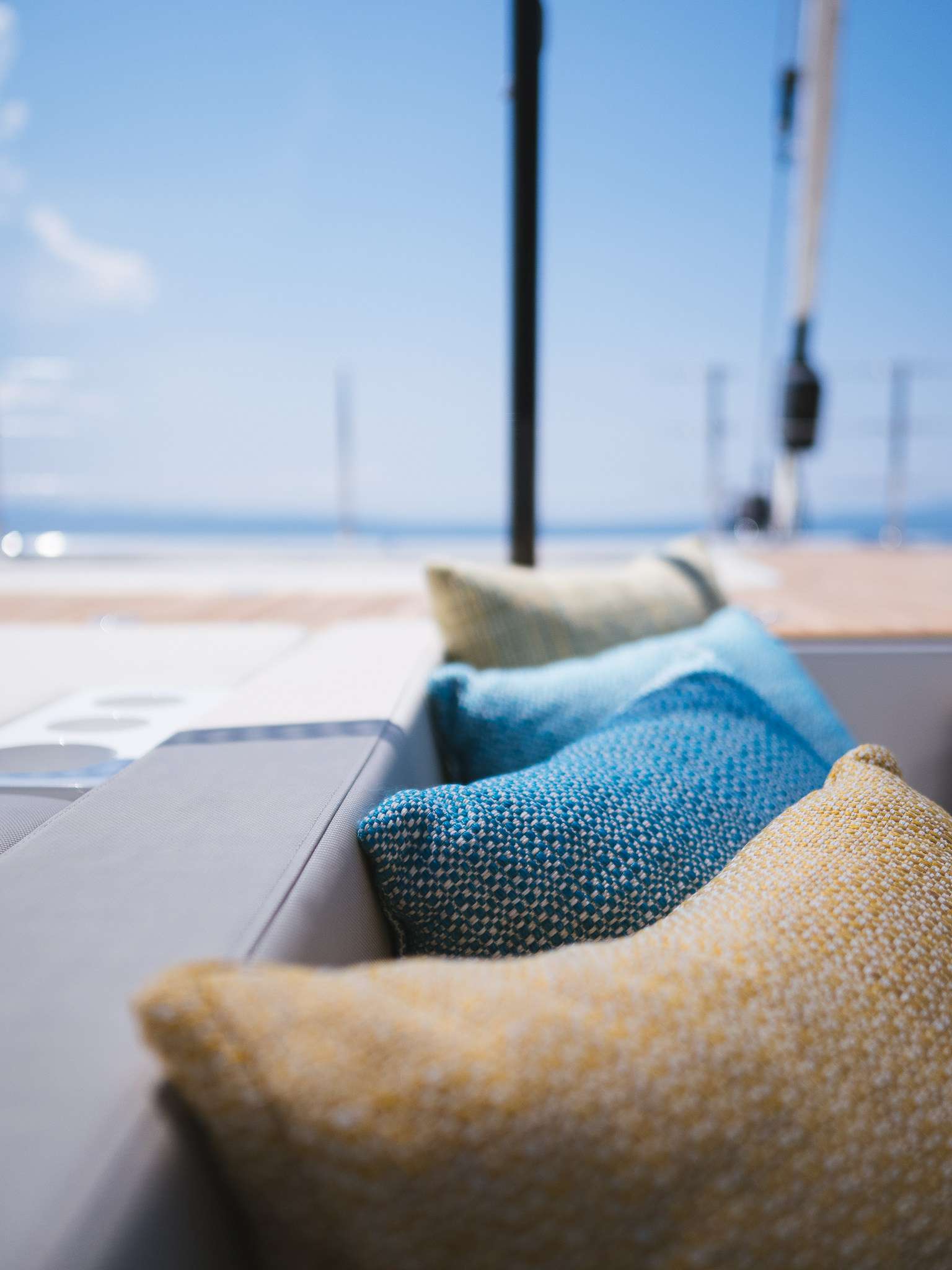 Sunreef 50 ZARA comfortably accommodates 8 in 4 spacious elegant guest cabins all ensuite, with separate cabins for crew. In each cabin, there is A/C unit with individual controls, plugs, adaptors, 4 pillows, a quilt, and complimentary bottled water. At every bathroom, guests will find bath towels, hand towels, cosmetic tissues, a hair dryer, and complimentary L'occitane toiletry. The cockpit is stocked with beach towels and complimentary sunscreen lotion. While housing the main helm, the large flybridge is definitely devoted to leisure with more than enough space for movable furniture, a fully-equipped wet bar and large sun pads. A perfect setting to calm down and relax after a long day in the sun. With no compromises to performance, the Sunreef 50 sailing catamaran is ready for charter holidays.